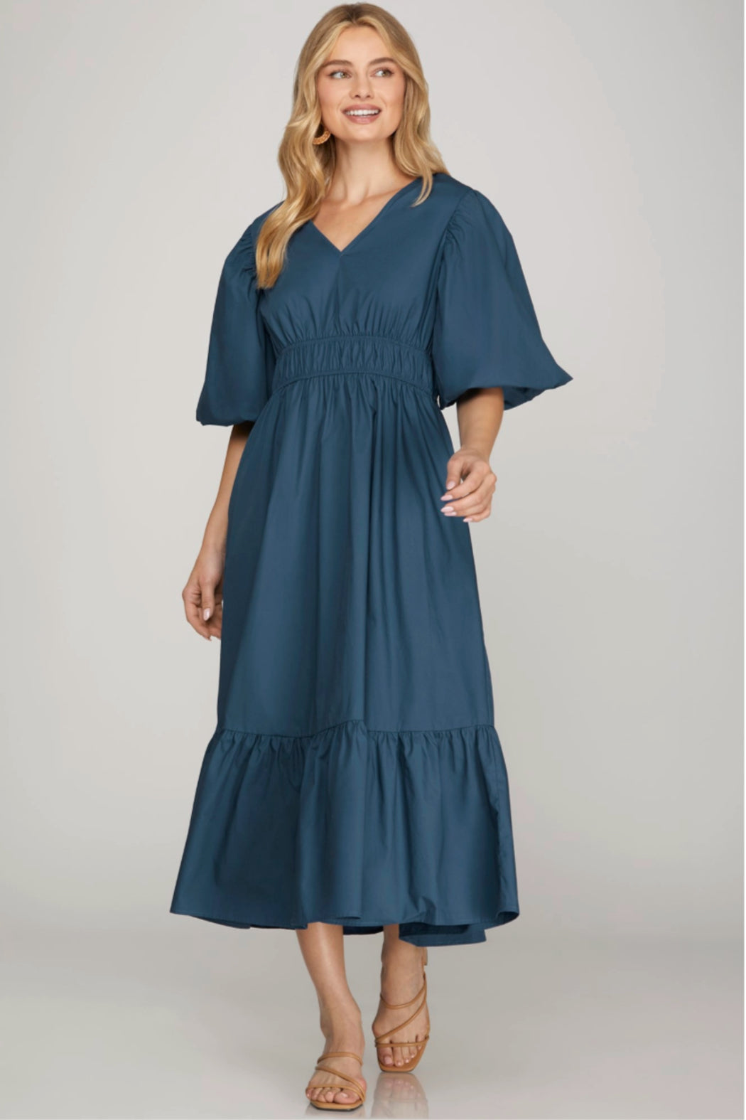 New Take Dress — Retro-Inspired Bubble Sleeve Midi in Dark Teal