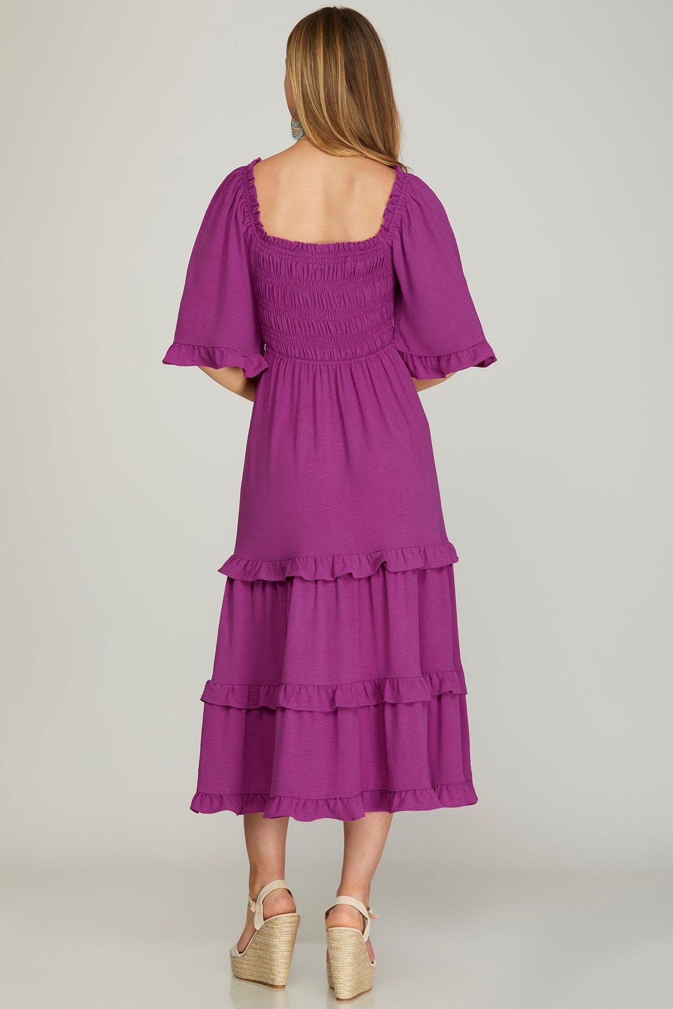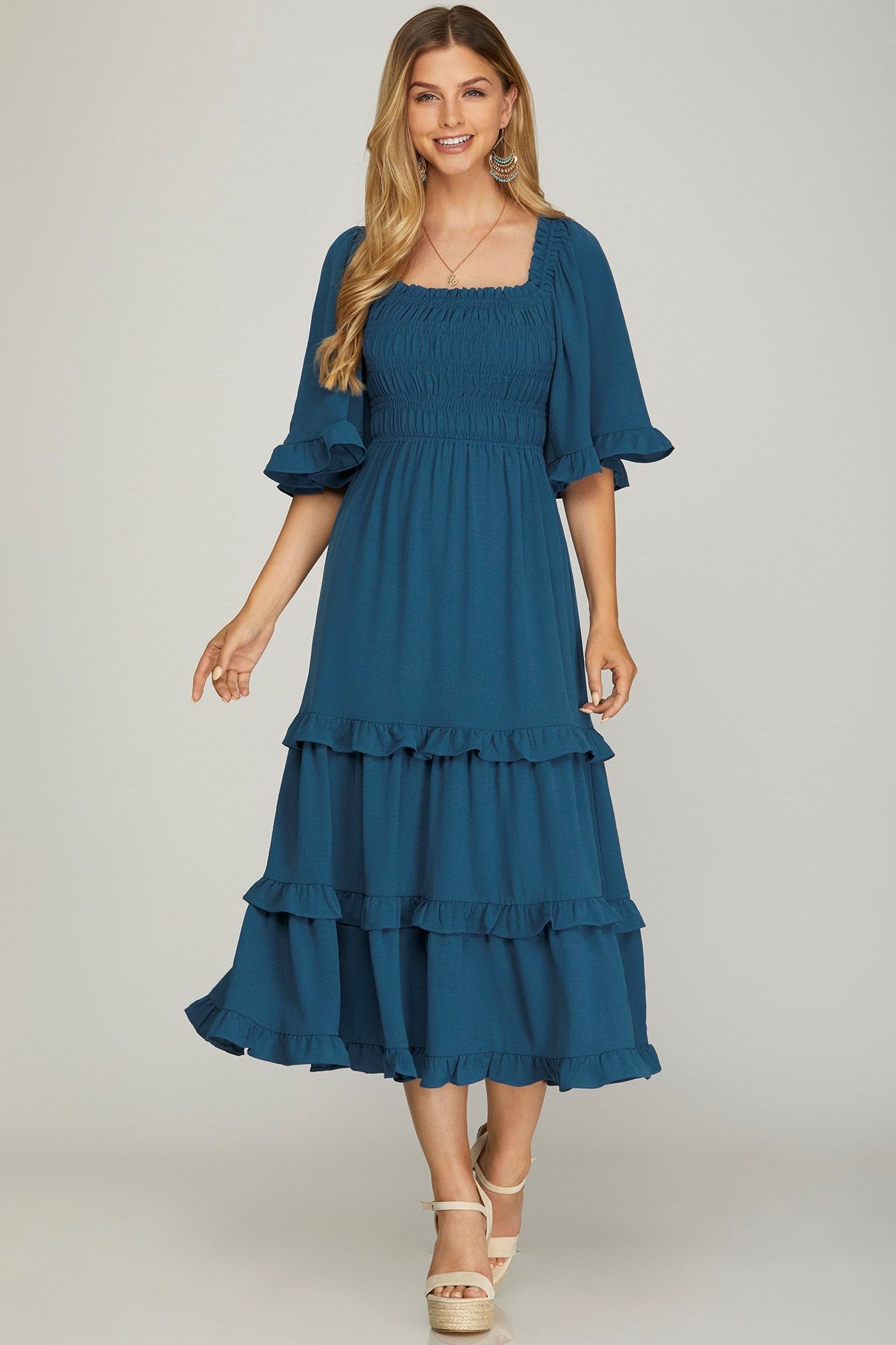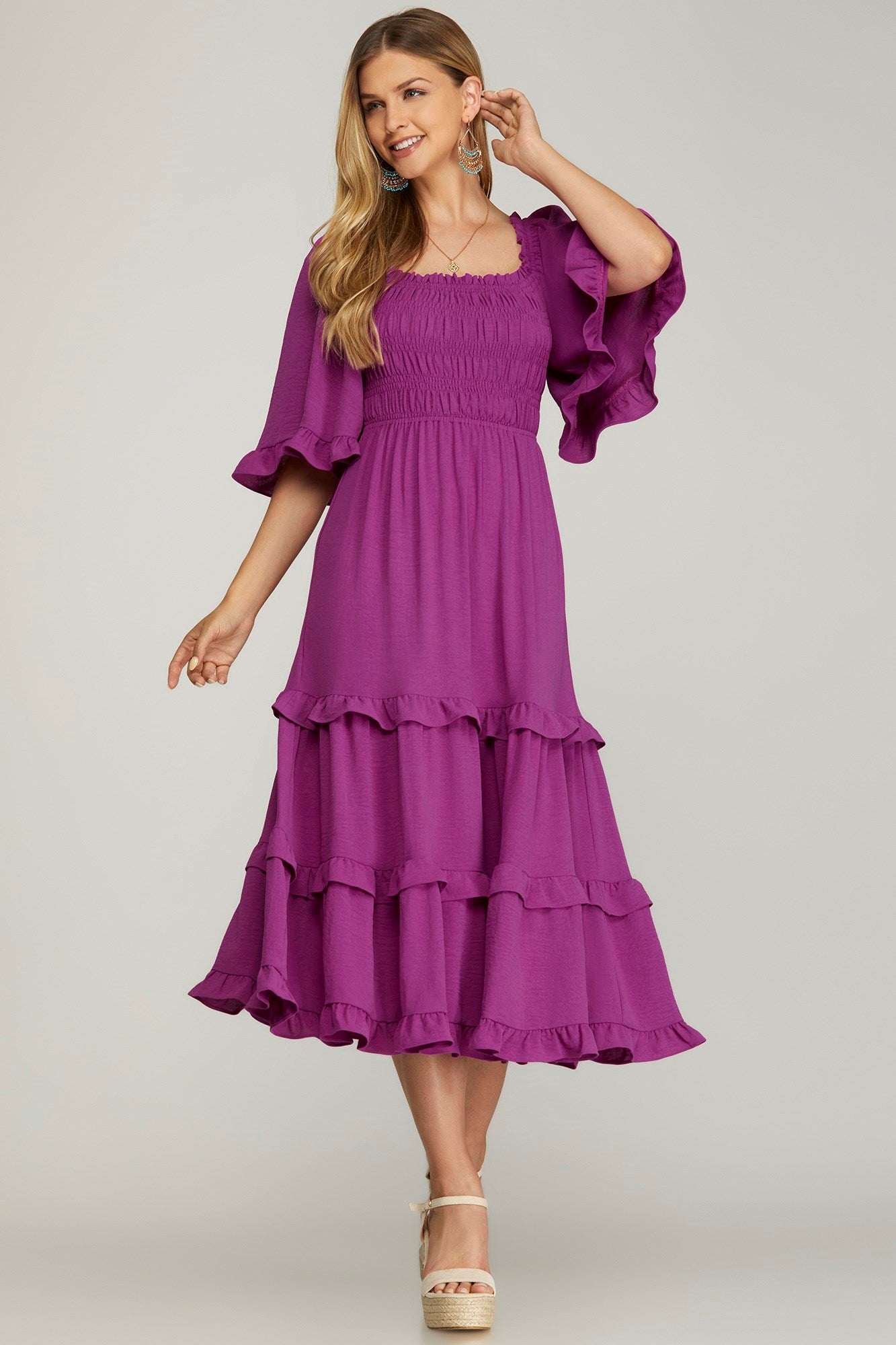 Stepping into fall with a touch of elegance and a dash of playfulness in our Bell Sleeve Square Neck Smocked Tiered Midi Dress! 🍁✨ This dress is everything you need to make a statement this season. The square neckline adds a modern twist, while the smocked bodice provides that perfect fit we all crave. And let's not forget those dreamy bell sleeves - they bring just the right amount of drama to your look!