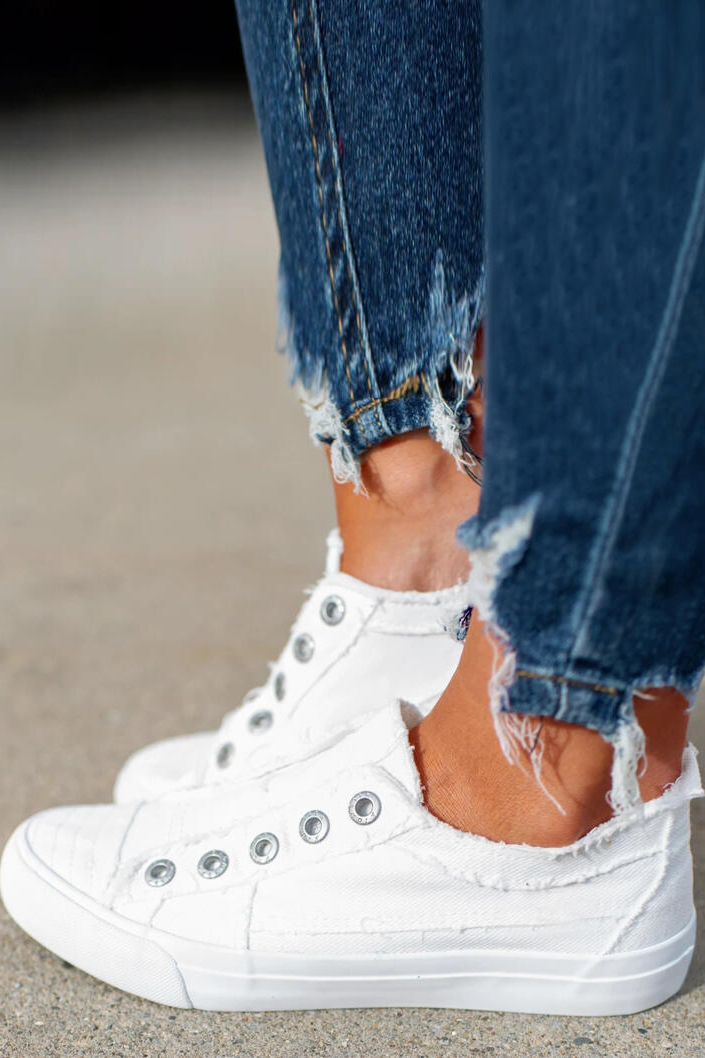 These sneakers feature a no string slip on style with a white sole bottom.