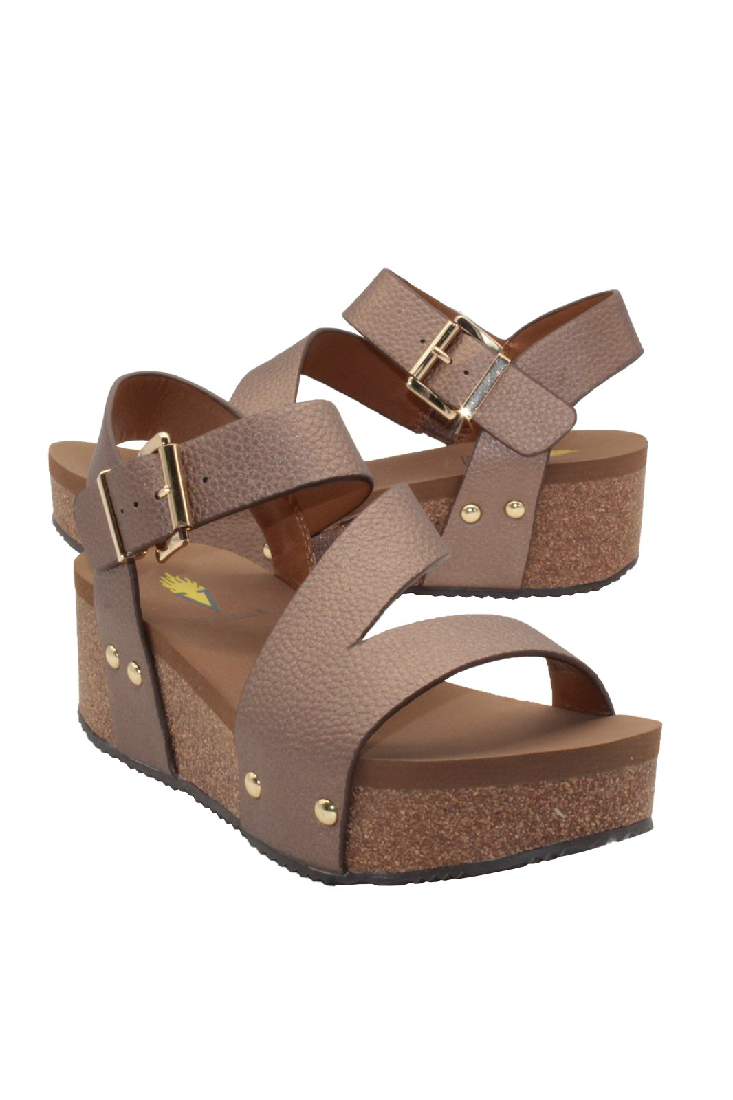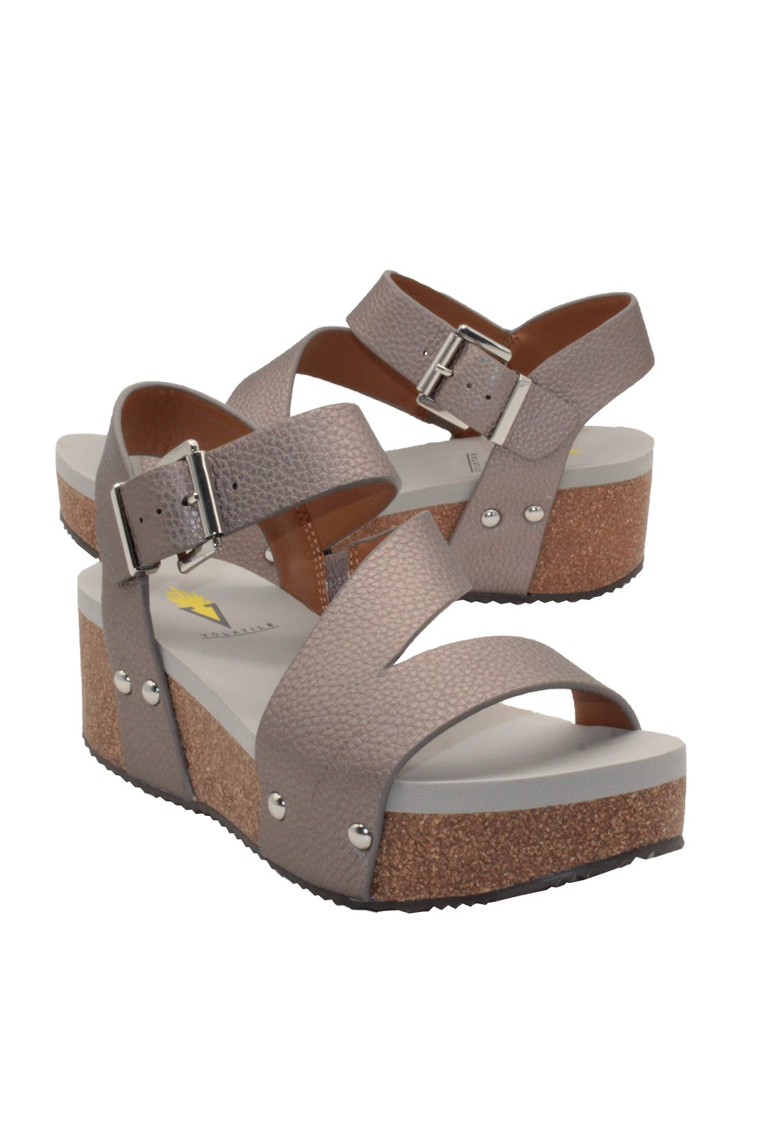 These Volatile wedges feature an asymmetrical sandal with back strap, adjustable buckle, cork wedge, and rubber sole. 2" heel height.