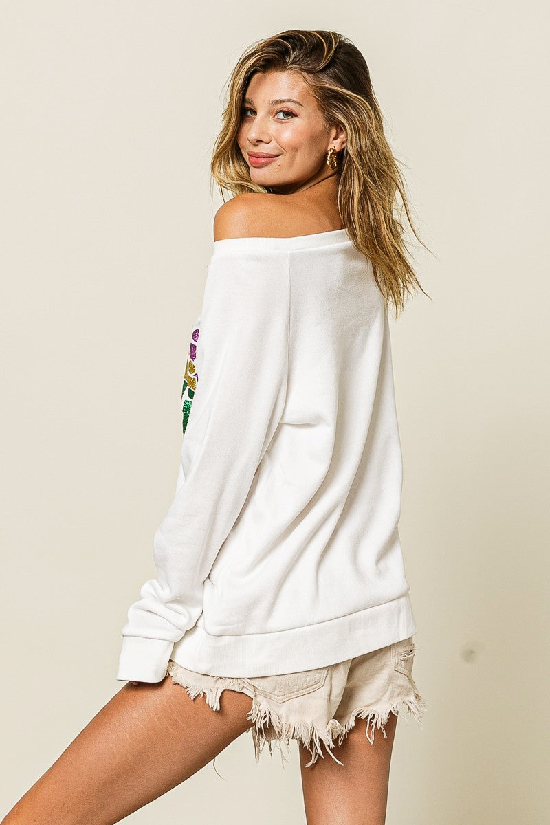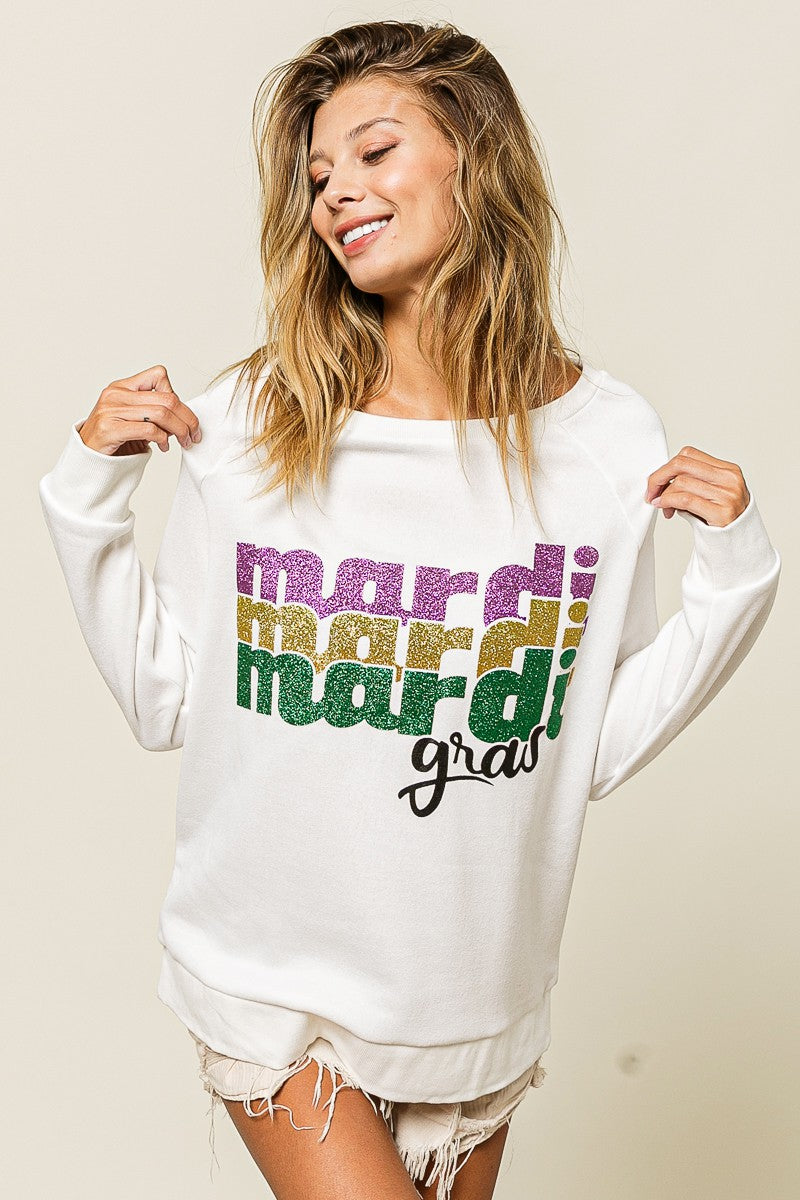 MARDI GRAS GLITTER LETTERING PULLOVER