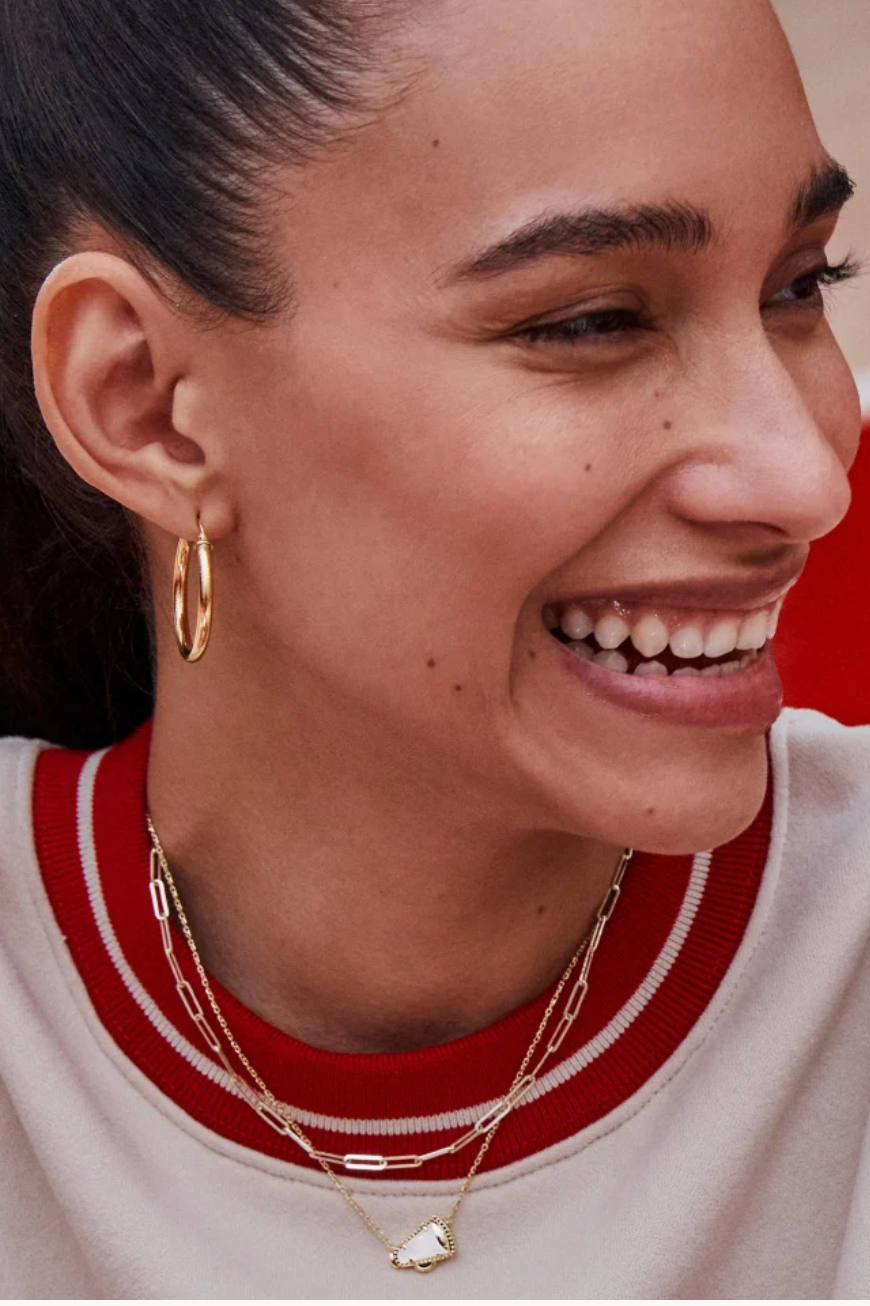 Cheer Gold Short Pendant Necklace in White Mother-of-Pearl – Show Your Team Spirit in Style Give your wardrobe an extra dose of cheer with the Cheer Gold Short Pendant Necklace in White Mother-of-Pearl! This fun, megaphone-shaped pendant is framed by our signature hoofprint detailing, giving it that signature Kendra Scott touch. Crafted in 14k yellow gold over brass and featuring a genuine White Mother-of-Pearl, this pendant exudes elegance while keeping things minimal and spirited. Perfect for showing off your team spirit, this necklace is sure to complement your look on game day or any day you want to add a little extra cheer. Why You’ll Love It: ✔ Fun & Spirited Design – A megaphone pendant that represents your team spirit. ✔ Minimal Yet Cheerful – A subtle yet bold accessory that adds personality to any outfit. ✔ Adjustable Fit – Features a 19" chain with a single adjustable slider bead for a custom fit. ✔ Delicate Yet Durable – Made with 14k yellow gold over brass for lasting beauty and shine. ✔ Perfect for Layering – Ideal for stacking with other necklaces or wearing on its own. Product Details: ✨ Metal: 14k Yellow Gold Over Brass ✨ Stone: White Mother-of-Pearl ✨ Pendant Size: 0.48"L x 0.63"W ✨ Chain Length: 19" with adjustable slider bead ✨ Closure: Lobster Clasp 📣 Show your spirit with the Cheer Gold Pendant Necklace – shop now and get ready to cheer in style!