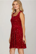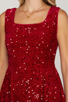 Be the main event in The Crimson Confetti Mini, the dazzling party dress that's ready for a celebration. Covered from the structured square neckline to the flirty hem in brilliant, deep ruby red sequins, this dress is pure, electrifying glamour.