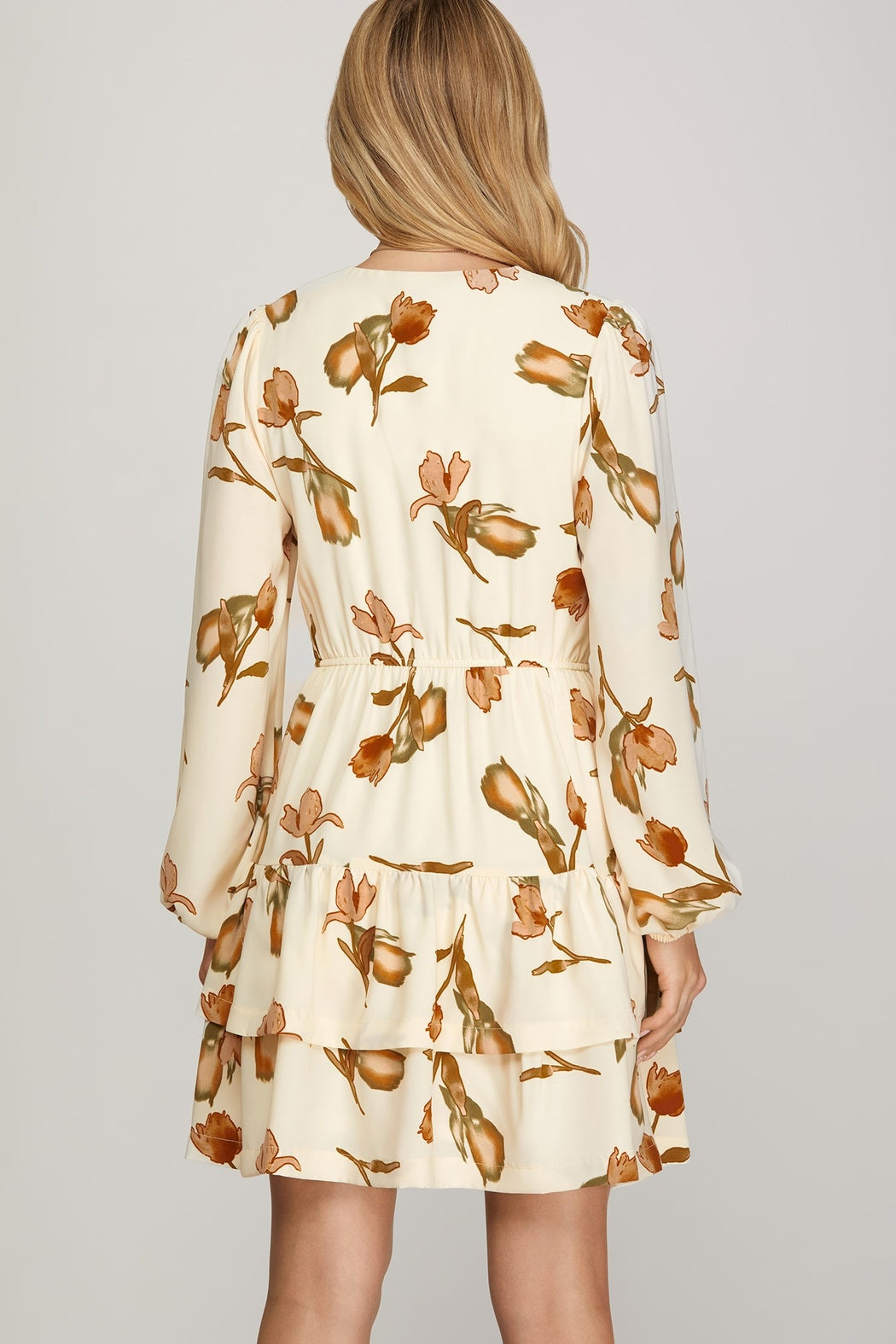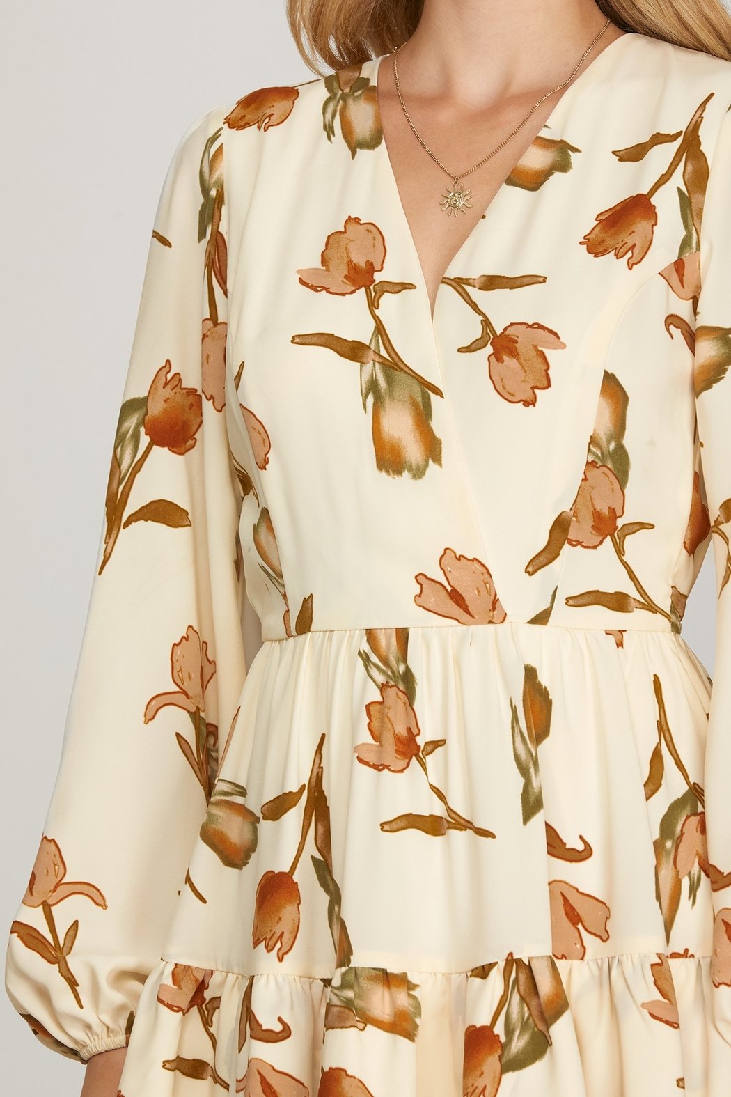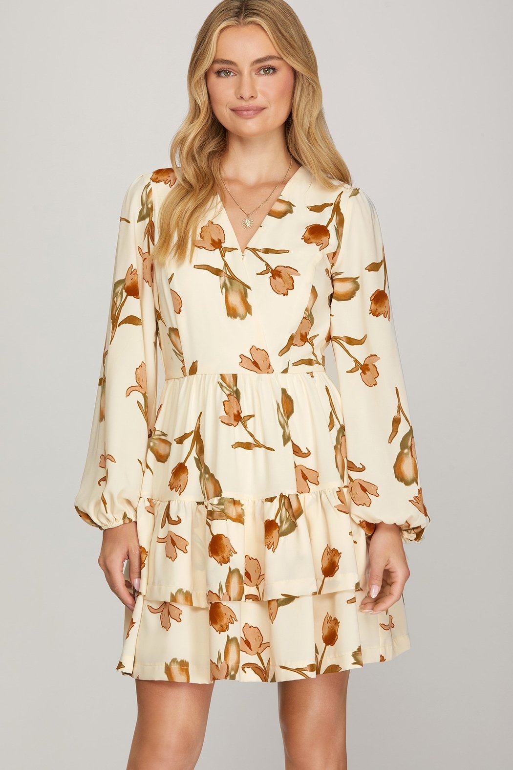 Channel effortless retro charm with the Desert Bloom Dress, a long sleeve woven mini designed for free-spirited style. Featuring a flattering surplice neckline, tiered skirt, and an easy elastic waistband, this dress blends comfort with vintage-inspired elegance. The bold floral print adds a touch of 70’s nostalgia, while the lightweight fabric makes it perfect for year-round wear. Pair it with boots and layered jewelry for a boho-fall look, or style it with sandals for sunny desert days. Key Features: Long sleeves with relaxed silhouette Surplice neckline for a feminine shape Tiered mini skirt with playful movement Elastic waistband for comfort and fit Lightweight woven fabric with retro-inspired print Perfect For: Fall festivals, casual outings, concerts, or adding a vintage twist to everyday style.