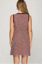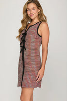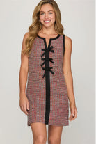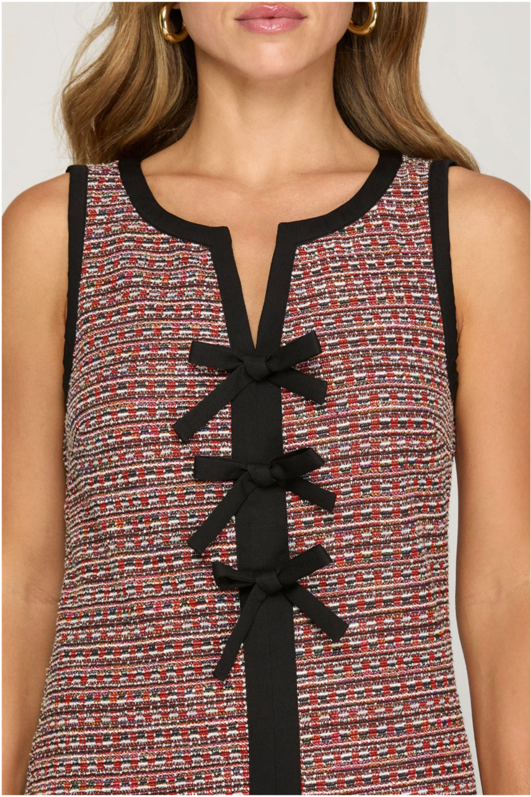 The "Fifth Avenue" Bow-Detail Tweed Mini Dress Product Description: Iconic Style with Uptown Polish Embrace timeless elegance with The "Fifth Avenue" Tweed Dress, a piece that captures the sophisticated spirit of classic city chic. This dress is perfectly tailored for a polished look, making it ideal for the office, cocktail hours, or upscale events. The dress is crafted from a rich, textured tweed fabric (in red, black, and white tones) that offers a high-end feel. Its sleeveless sheath silhouette is structured and flattering. The design is perfected with striking black trim running down the center, adorned with three delicate decorative bows that add a playful yet refined touch. Pair this tweed mini dress with patent leather pumps and a structured handbag for a powerful professional look, or layer it over a black turtleneck and tights for cozy winter sophistication. Key Features & Selling Points: Classic Tweed Texture: A high-quality woven look in a multi-tonal mix (red/black/white). Chic Bow Details: Three refined black decorative bows down the front. Structured Sheath Fit: A flattering, tailored, sleeveless silhouette. Elegant Black Trim: Accents the neckline and center panel for a polished finish. Versatile Occasion Wear: Perfect for work, holiday parties, and smart-casual events.