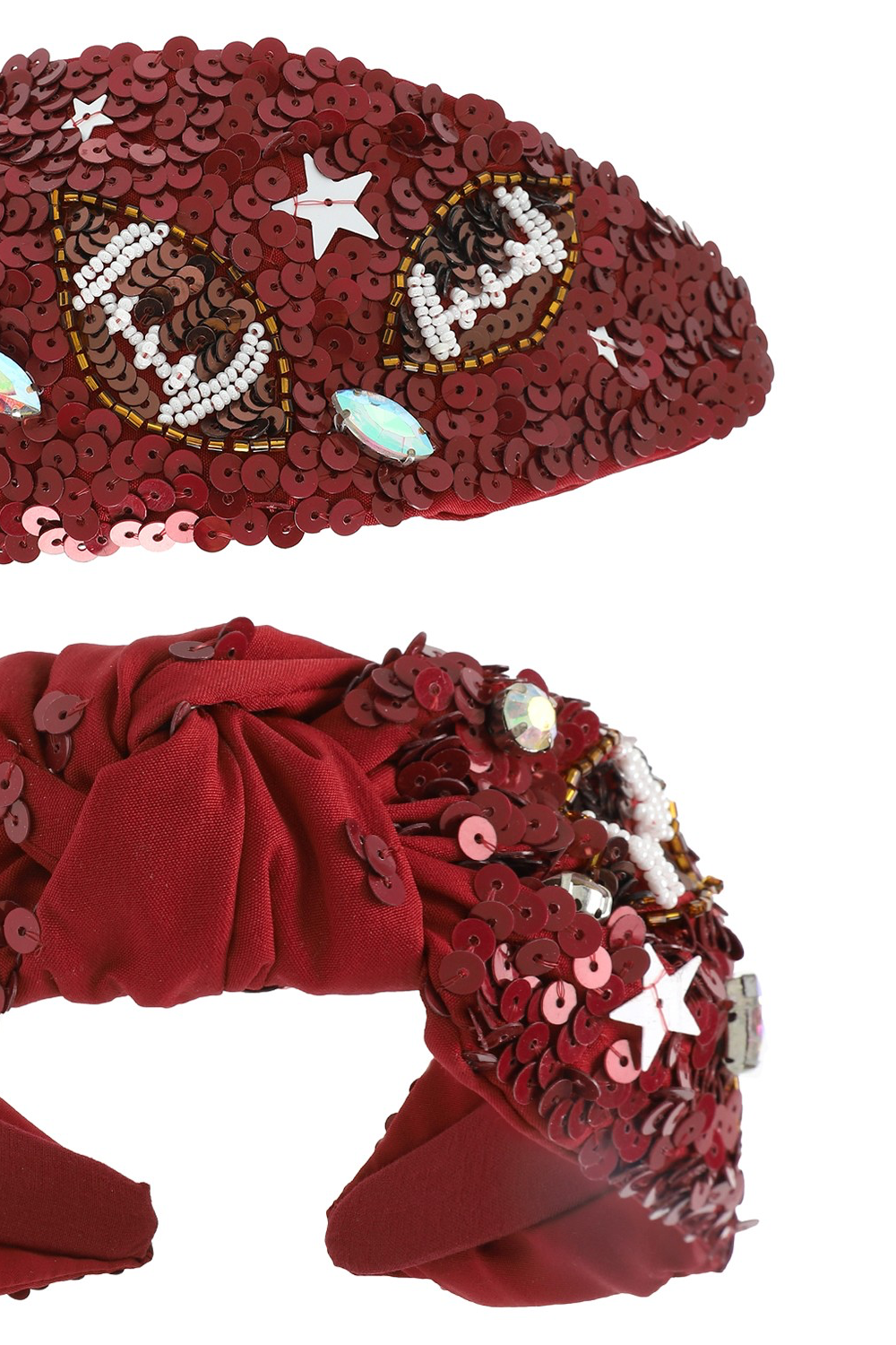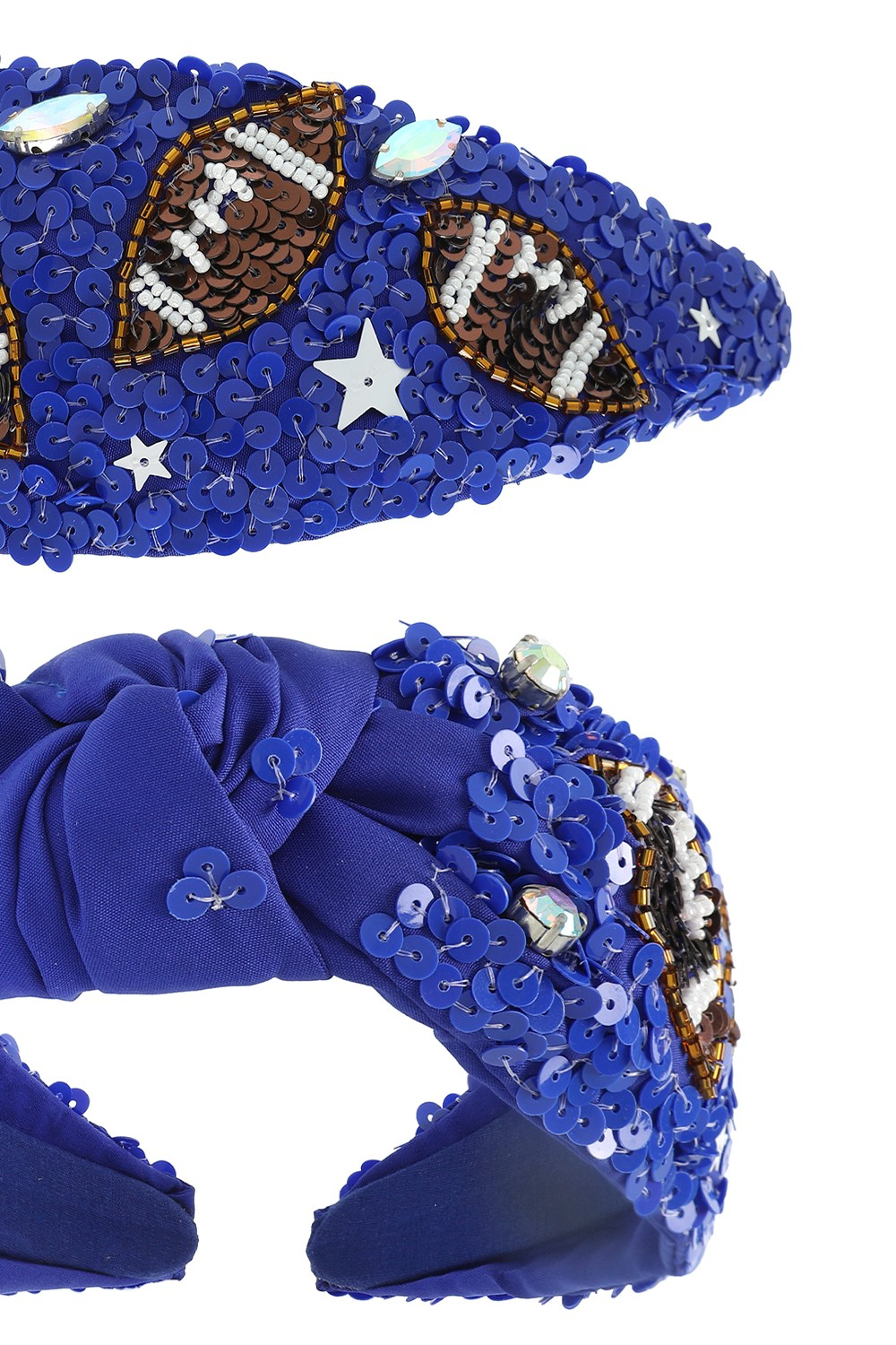 Introducing our stunning Sports Star Football Gemstone Beaded Embroidery Top Knotted Headband, the ultimate accessory to showcase your team spirit in style. With a height of 6.5" and a width of 2.5", this eye-catching piece combines intricate beaded embroidery, sparkling sequins, dazzling crystals, and vibrant gemstones to create a truly festive look.