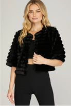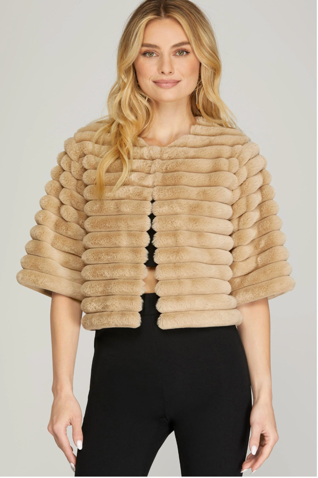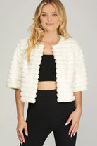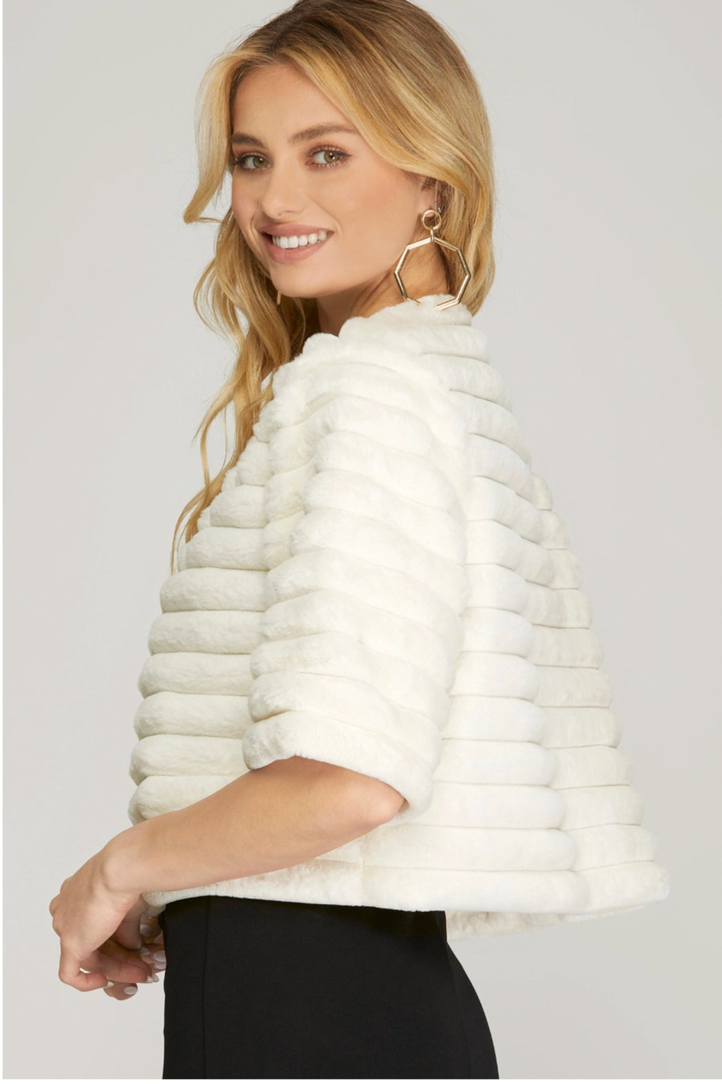 Crafted from incredibly soft, high-quality faux fur in a beautiful ivory/cream shade, this shrug features a distinctive horizontal ribbed texture that gives it depth and luxurious appeal. The signature half-sleeve (or 3/4-sleeve) cut and flattering cropped bolero silhouette are designed to perfectly complement your favorite cocktail dresses, jumpsuits, or high-waisted separates without hiding your main outfit.
