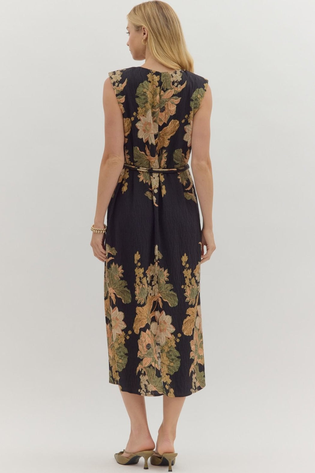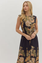 Step out in vibrant style with the Golden Tapestry Dress, a stunning floral print midi that blends vintage charm with modern ease. This dress is your perfect companion for garden parties, brunches, or elevated everyday wear.