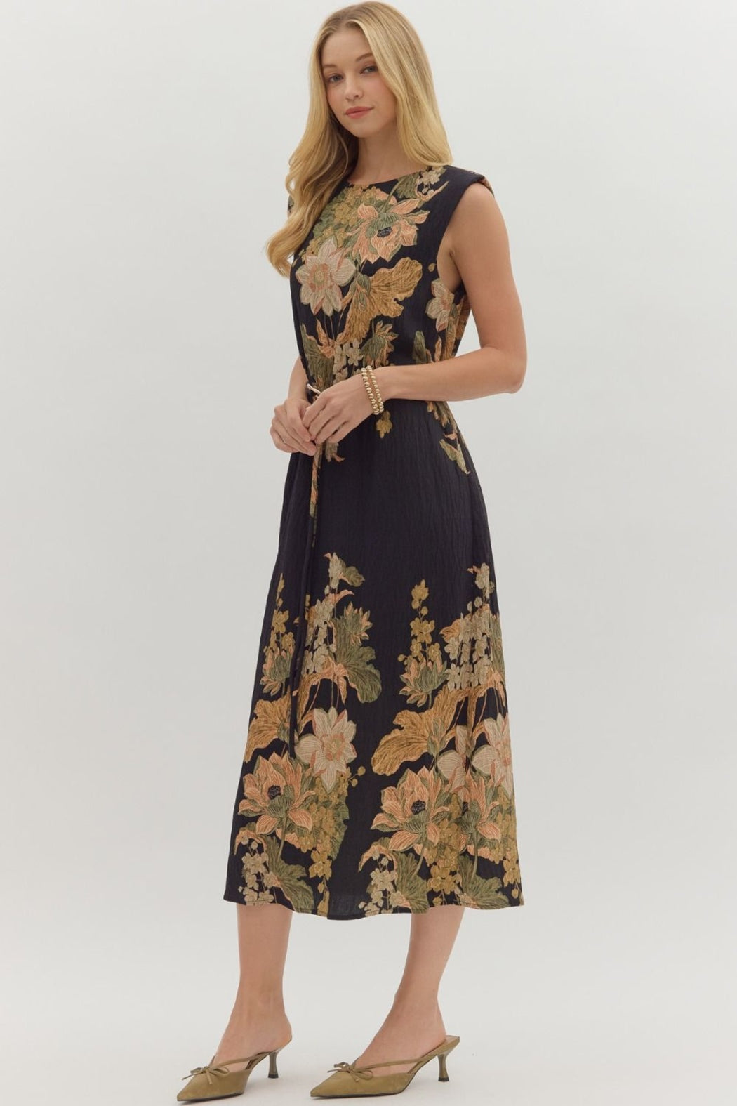 Golden Tapestry Dress: Effortlessly Chic Floral Midi