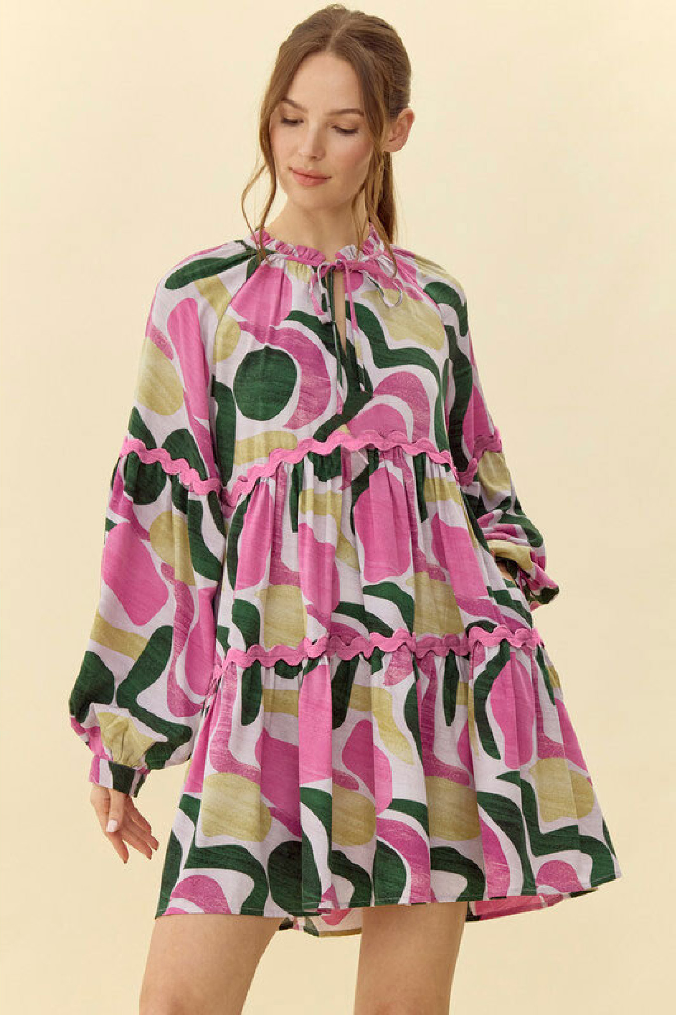 Step into a dreamscape of comfort and style with our stunning abstract print dress 🌟. This eye-catching piece effortlessly combines whimsy and elegance, making it the perfect addition to your wardrobe this season. The frilled tassel-tie neck adds a touch of playful sophistication, while the side pockets bring practicality to this fashion-forward design.