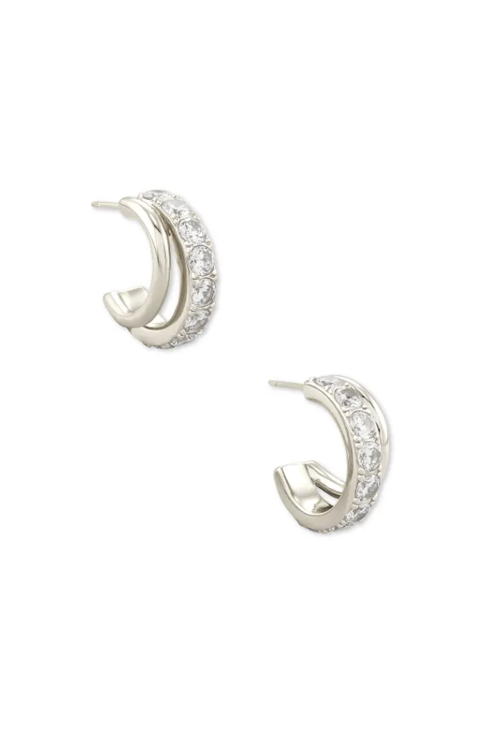 “How fun are these?! The combination of a bold silhouette with classic sparkle creates a costume look in the best way possible.” - Kendra Double the sparkle with the Livy Gold Huggies in White Crystal. Featuring an asymmetric split hoop design. Dual shine for your everyday. Metal: 14k Gold Plated Over Brass Material: White Crystal Size: 0.75" outside diameter Closure: Earpost