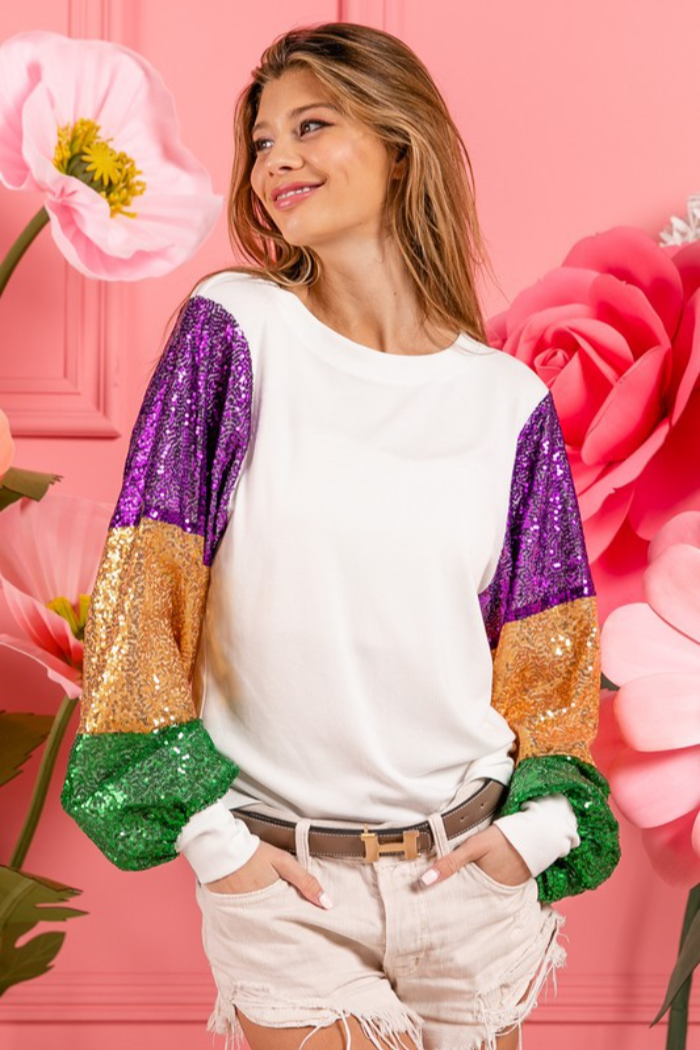 Mardi Gras Color Block Sequin Knit Top – Sparkle in Festive Style Shine bright this Mardi Gras season with the Mardi Gras Color Block Sequin Long Bubble Sleeve Knit Top. Designed to turn heads, this top combines bold sequin accents and classic Mardi Gras hues with a comfortable knit fabric, making it perfect for parades, parties, and carnival celebrations. Key Features: Color Block Sequin Design: Dazzling purple, green, and gold sequins capture the essence of Mardi Gras in a bold, festive pattern. Bubble Sleeves with Cuffs: Long, flowing sleeves add a playful touch, while the cuffed ends provide a polished and snug finish. Round Neckline: A versatile neckline that flatters every outfit. Comfortable Knit Fabric: Soft, stretchy material ensures a cozy fit, perfect for all-day wear during festivities. Sizing Information: Available in sizes: S, M, L, XL Fit Guide: Runs true to size. For a relaxed fit, consider sizing up. Care Instructions: Hand wash cold or machine wash on a gentle cycle. Turn inside out to protect sequins. Lay flat to dry. Avoid bleach and ironing directly on sequins. Style Tips & Accessories: Pair this statement top with dark jeans or leggings for a chic yet casual look. Add gold hoop earrings and a bold purple or green clutch for a complete Mardi Gras ensemble. Perfect with heeled boots or sparkly sneakers for an extra festive touch! šŸ‘‰ Add the Mardi Gras Color Block Sequin Knit Top to your wardrobe today and celebrate in glamorous style!