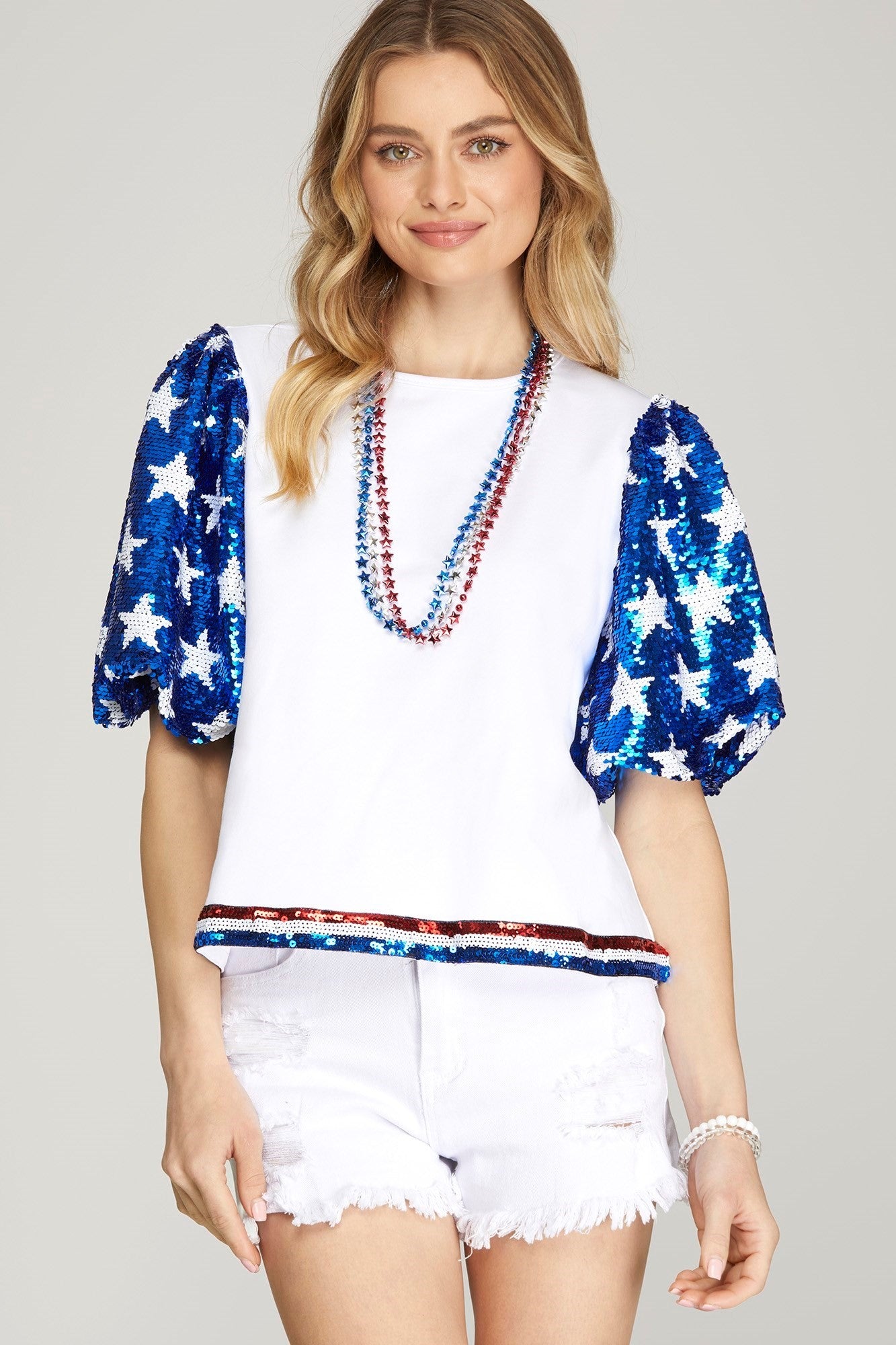 Celebrate this 4th of July in dazzling fashion with our Sequin Star Sleeve French Terry Knit Top. Perfect for those festive backyard barbecues, fireworks shows, or just a casual day out, this top combines comfort and sparkle effortlessly. Featuring beautifully detailed sequin stars on the sleeves that shine bright like your patriotic spirit, it's an absolute must-have to elevate your Independence Day wardrobe.