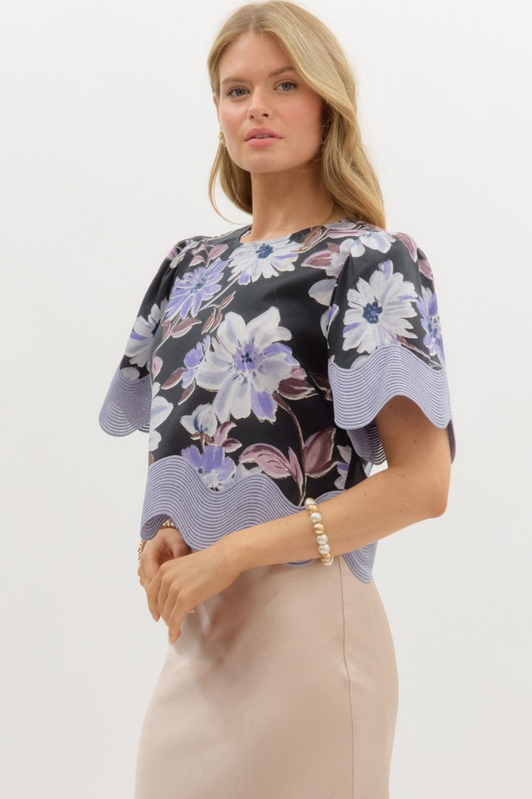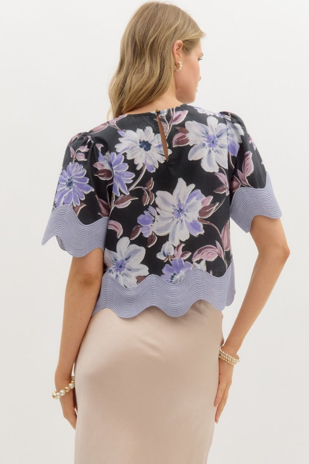 Embrace midnight elegance in the Moon Bloom Blouse, a dreamy statement piece that blends moody florals with effortless sophistication. Designed in a lightweight woven fabric, this short-sleeve pullover top features an enchanting black and midnight floral print, a relaxed fit, and oversized trim finishes at the hem and sleeves for added drama. A single button keyhole closure at the back completes the look with a delicate touch.