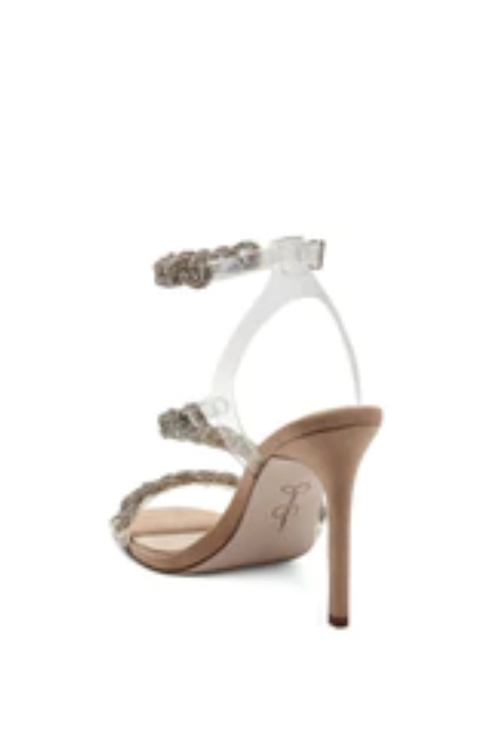 Jessica Simpson strappy sandal with a braided and beaded decoration and clear strap.