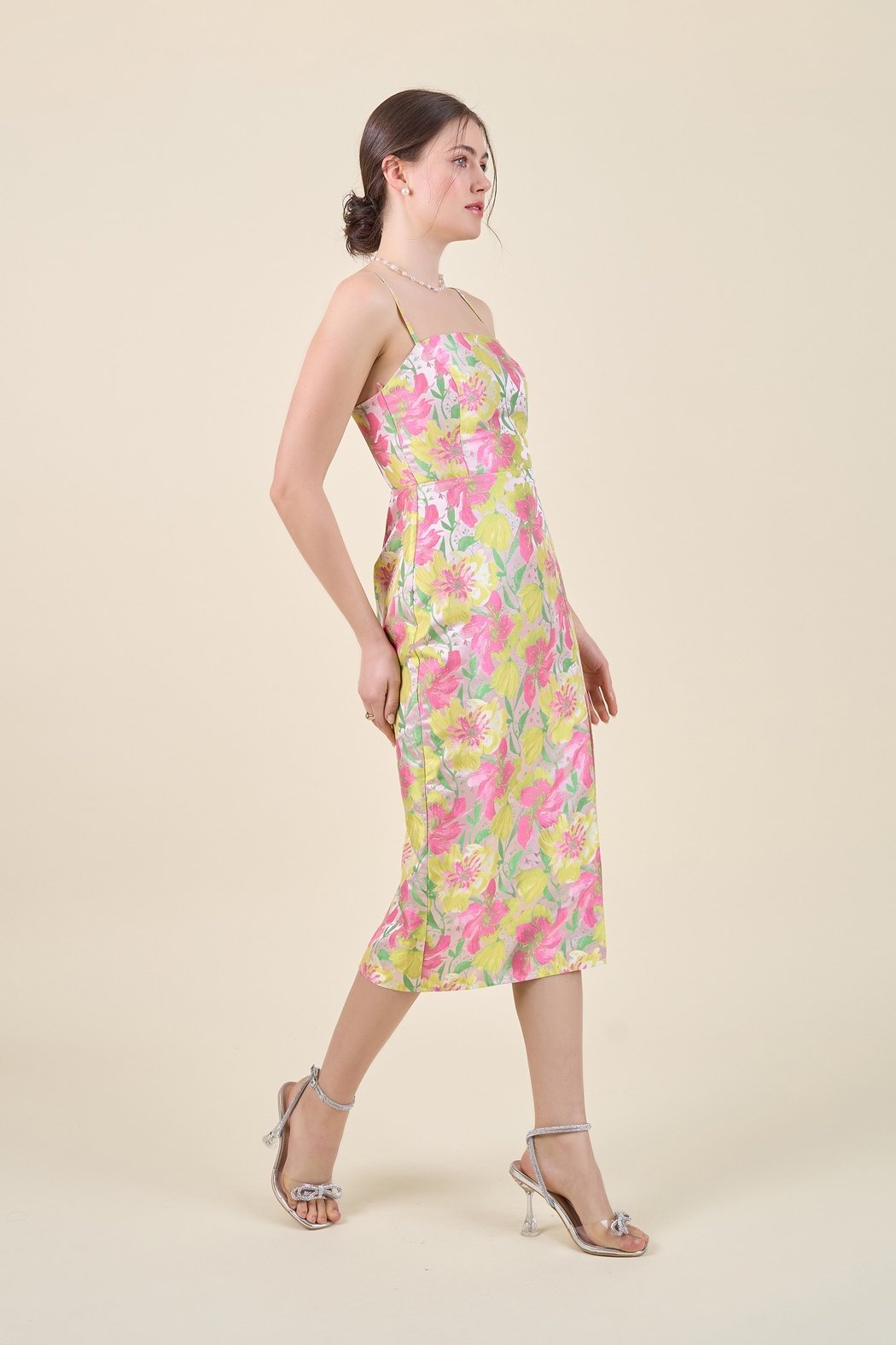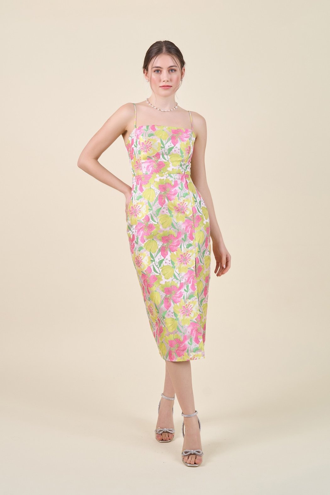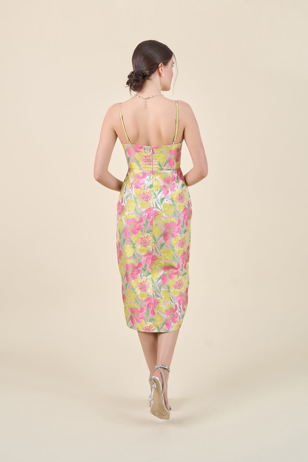 Tags: floral midi dress, 70s inspired dress, vintage style dress, garden party outfit, old money aesthetic, slit front dress, jacquard midi dress, timeless floral dress, elegant spring dress