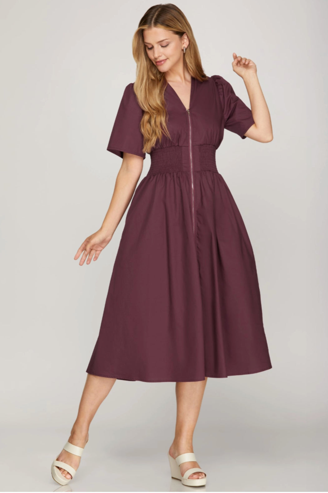 Short Sleeve Smocked Waist Front Zip Midi Dress with Pockets