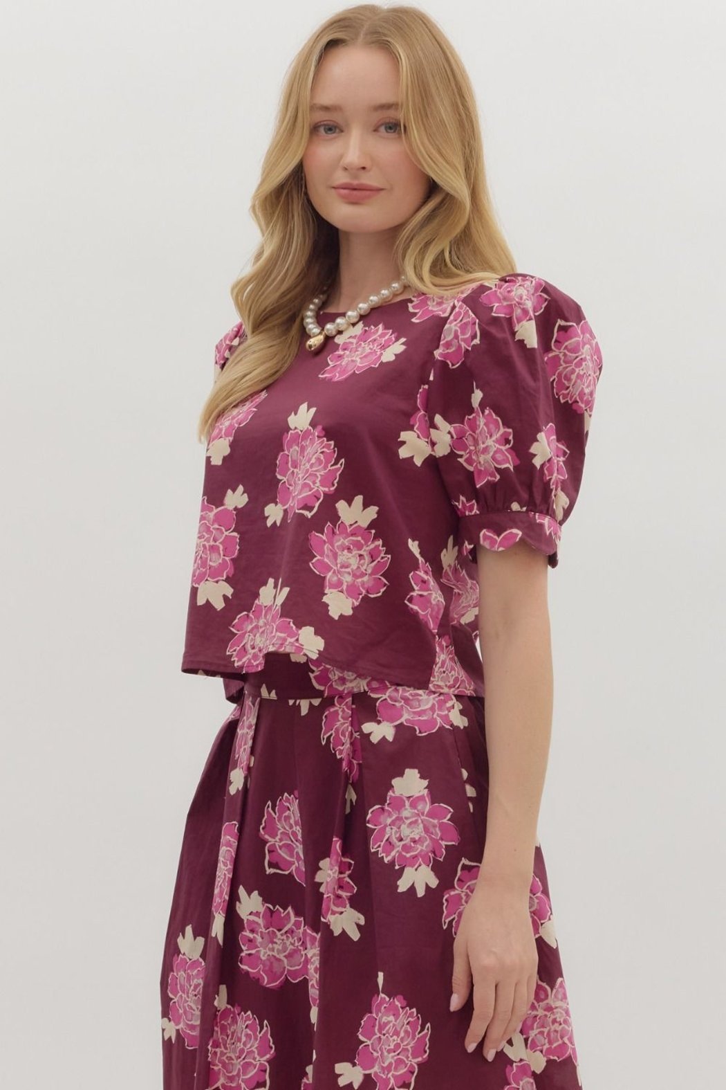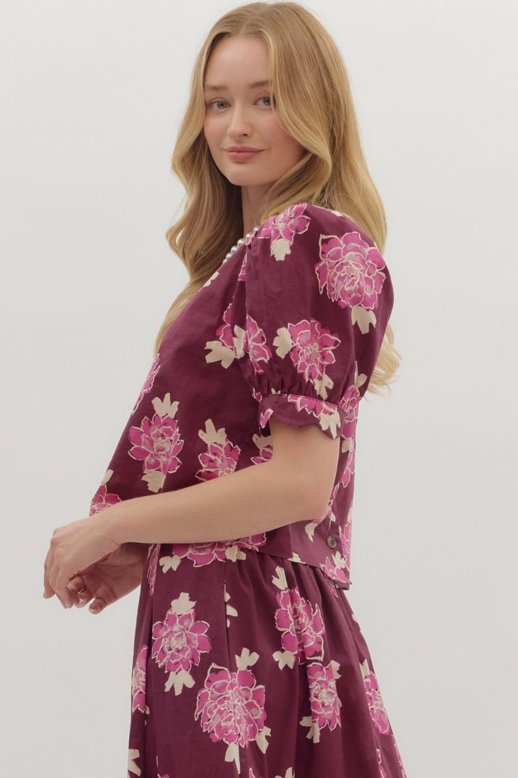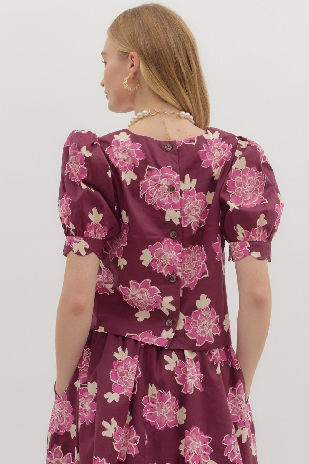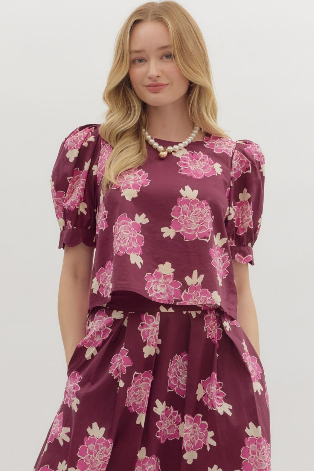 Rosewood Top – Romantic Floral Scallop Puff Sleeve Blouse Bring timeless charm to your wardrobe with the Rosewood Top, a lightweight woven blouse designed for effortless elegance. Featuring a delicate floral print, scalloped finish detail, and feminine puff shoulder sleeves, this top blends vintage-inspired romance with modern wearability. The button closure at the back adds a touch of refinement, while the non-sheer, breathable fabric makes it perfect for all-day comfort. Pair the Rosewood Top with high-waisted jeans for a casual weekend look, or tuck it into a midi skirt for a polished, boutique-chic outfit. Ideal for brunch, seasonal events, or everyday wear, this floral puff sleeve top is a must-have for your fall and spring wardrobe rotation. Details: Floral print with scalloped finish band detail Puff shoulder sleeves for a feminine silhouette Back button closure Unlined, non-sheer woven fabric Lightweight and comfortable