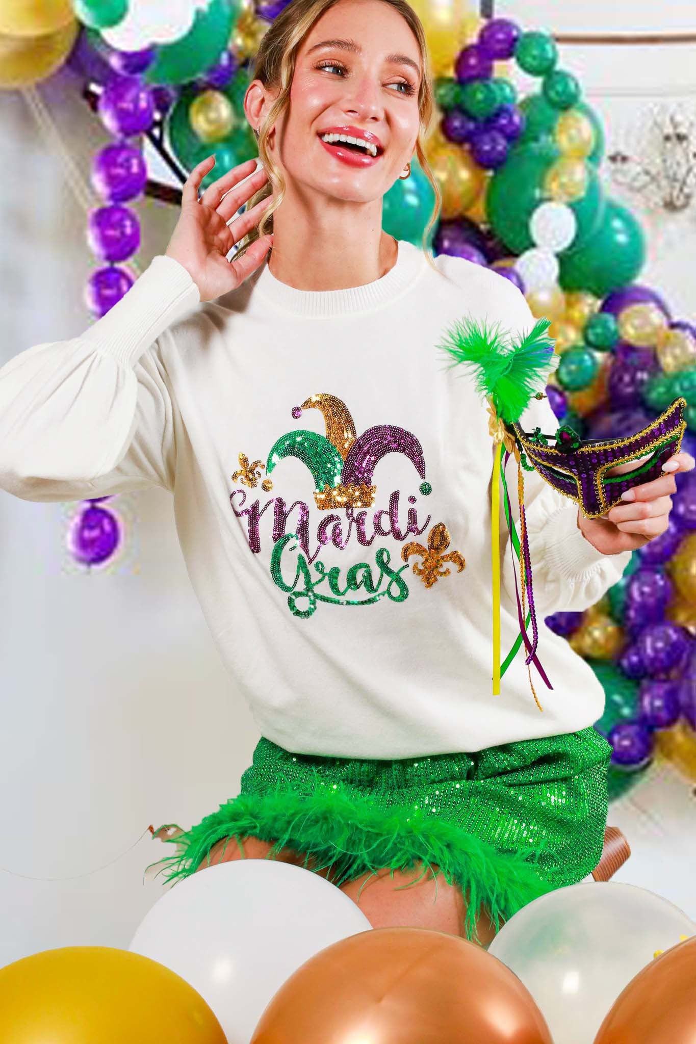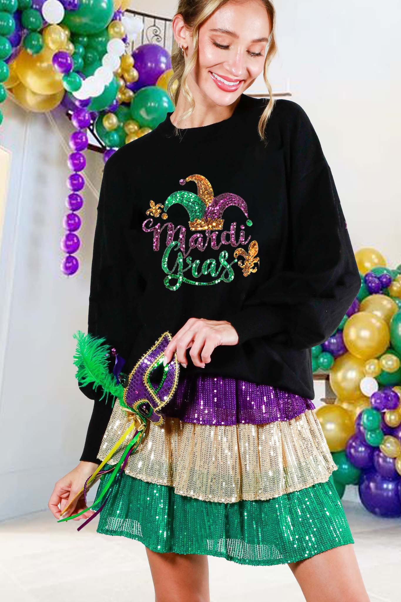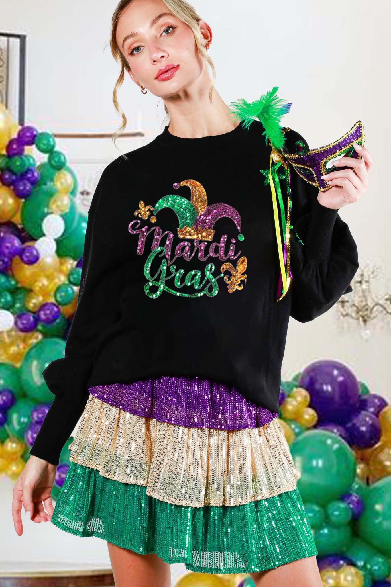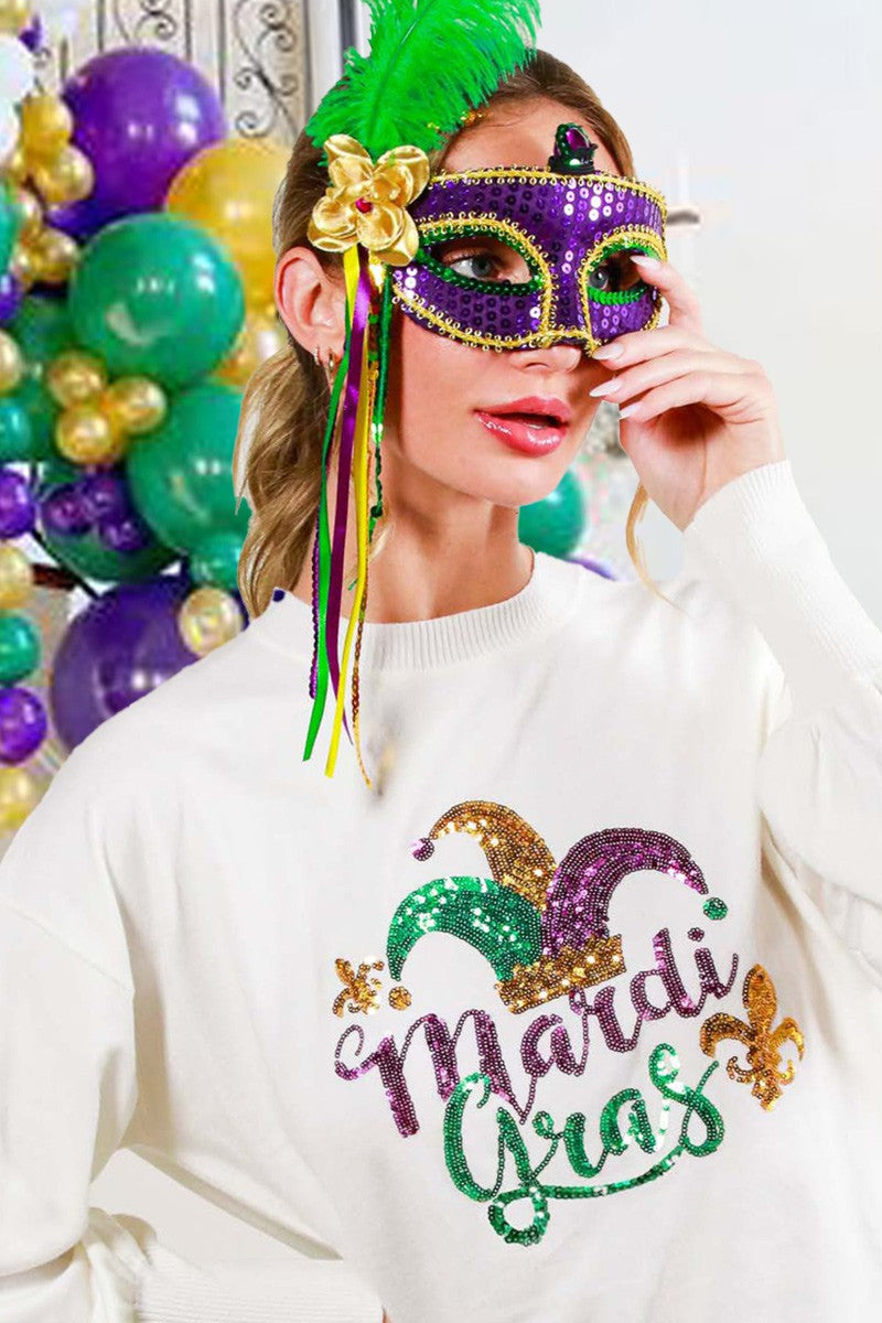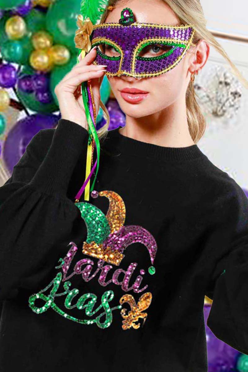 👉 Celebrate in style with the Crew Neck Long Sleeve Sequin Mardi Gras Sweater Top – order yours now and let the good times roll!