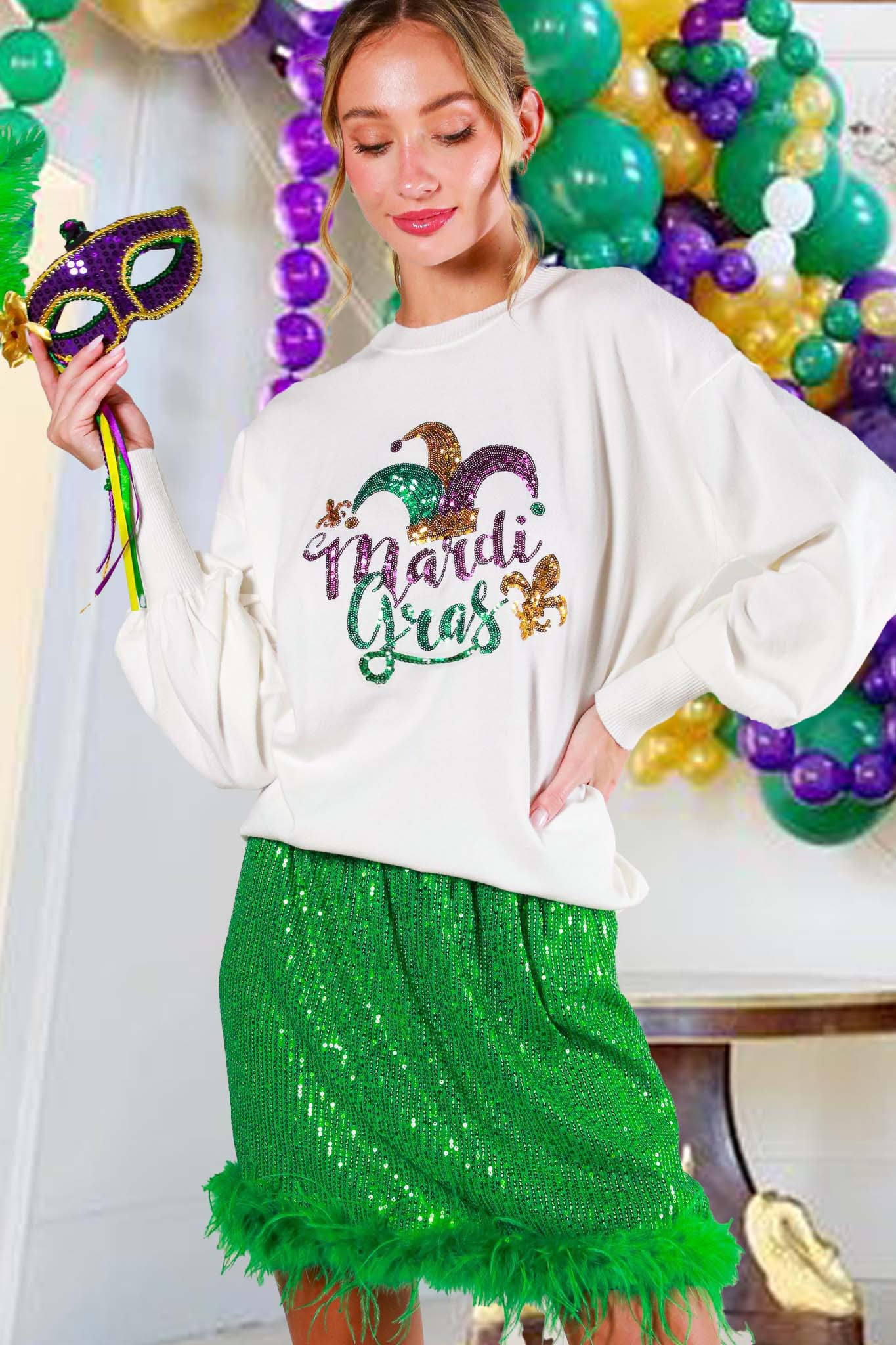 Festive Sequin Details: Eye-catching sequins in classic Mardi Gras colors—purple, green, and gold—add a fun, glamorous touch.