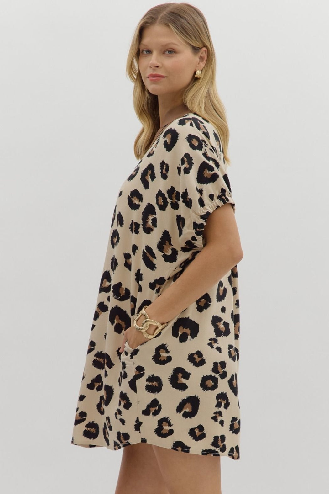 Spotted Charm Dress Make a statement with the Spotted Charm Dress, a playful take on a timeless print. Designed with an oversized leopard pattern, this mini dress features elasticated dolman sleeves for effortless movement and a contrast inset binding neck band collar for a polished finish. Fully lined, woven, lightweight, and non-sheer, it blends bold retro energy with everyday wearability. Pair it with boots for a striking 70’s-inspired look or keep it casual with sneakers for daytime outings. Key Features: Oversized leopard pattern mini dress Elasticated dolman sleeves for comfort and style Contrast inset binding neck band collar Lined, woven, lightweight, non-sheer fabric Retro-inspired design with bold, feminine charm