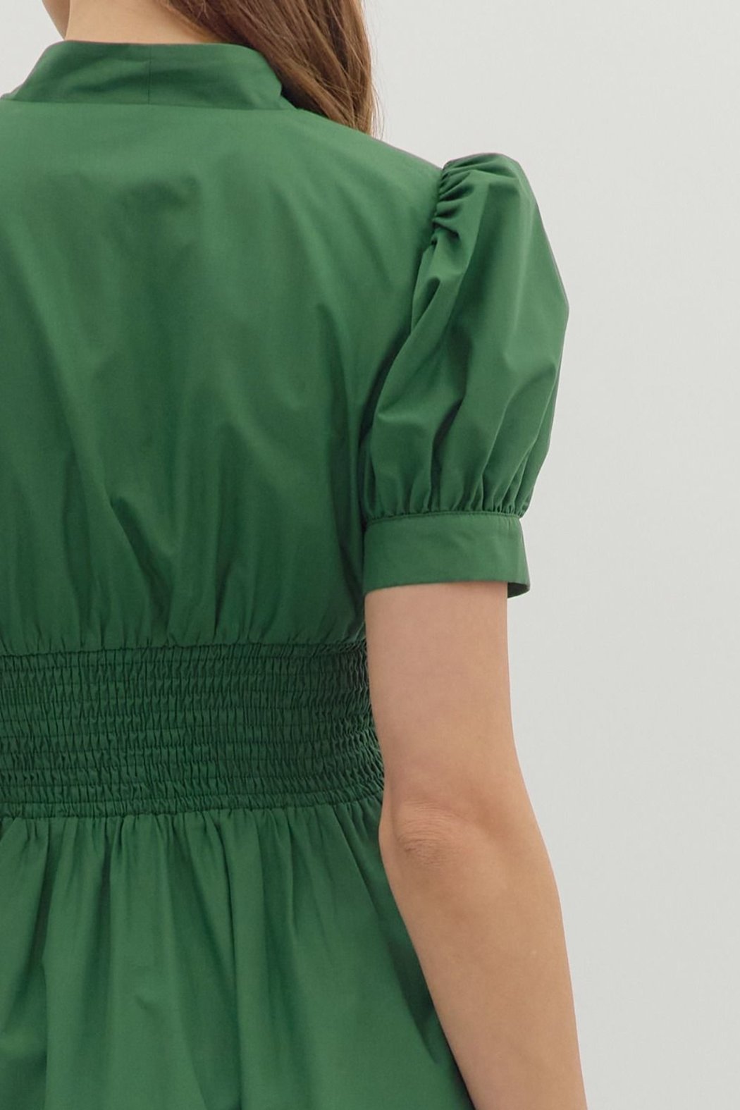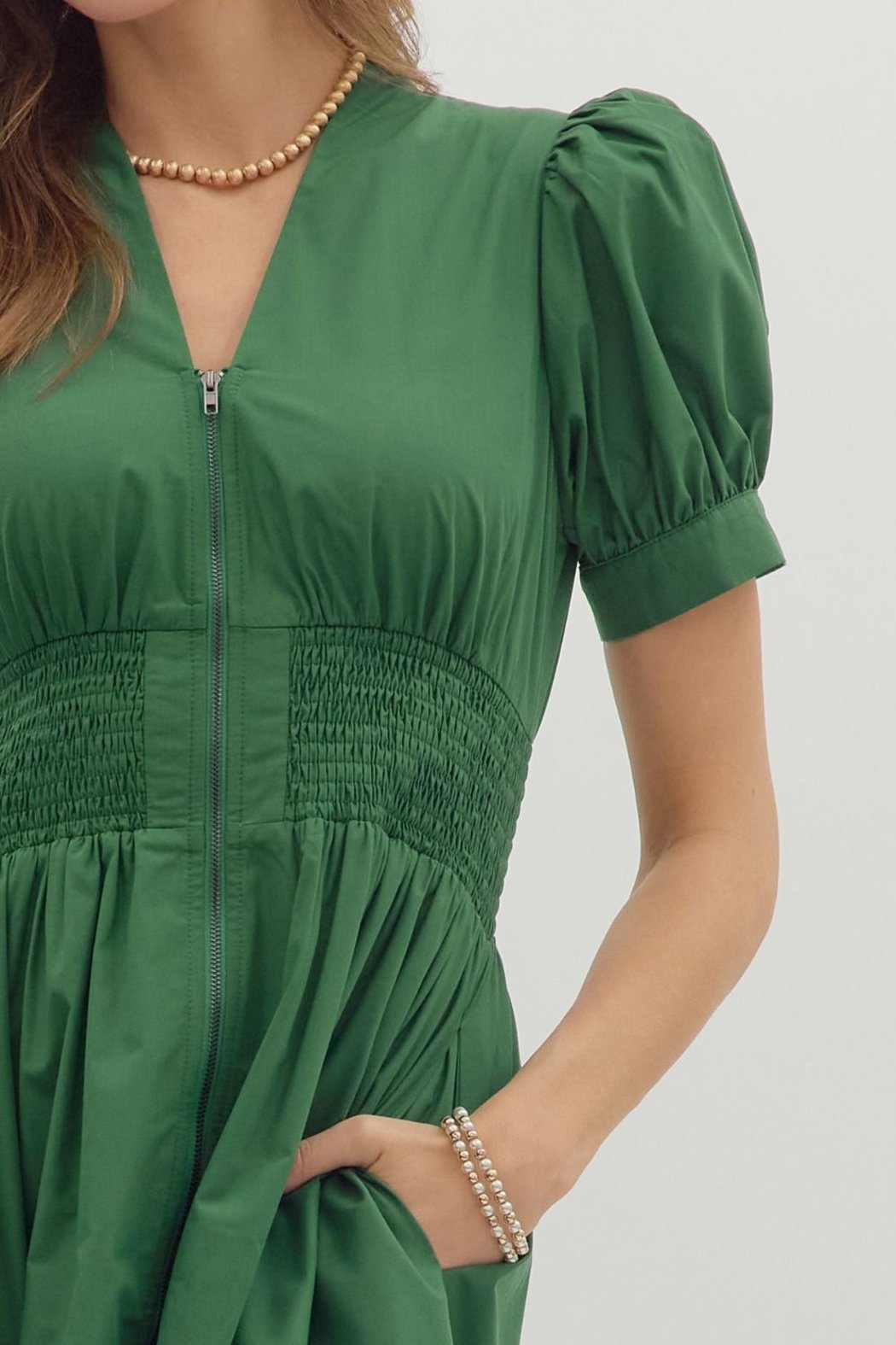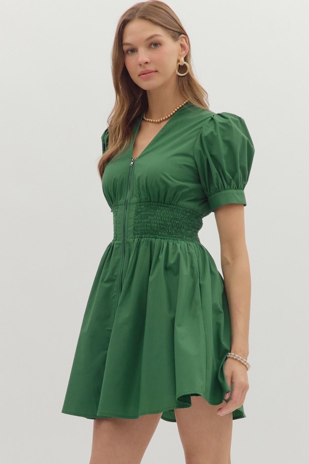 V-neck mini dress featuring a zipper front detail & smocked waistline.