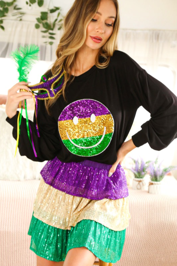 ROUND NECK LONG SLEEVE HAPPY FACE SEQUIN PATCH DETAIL TOP