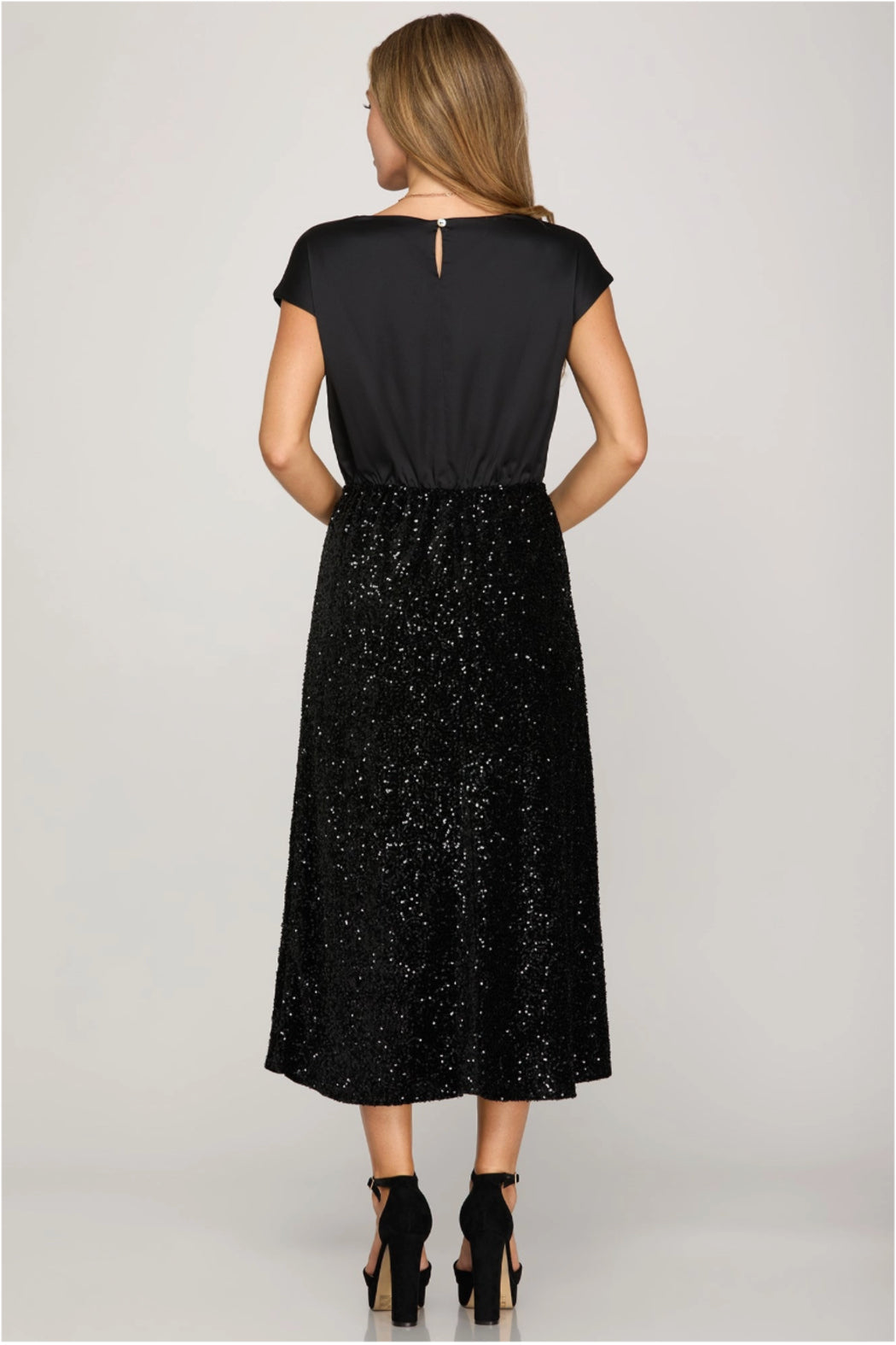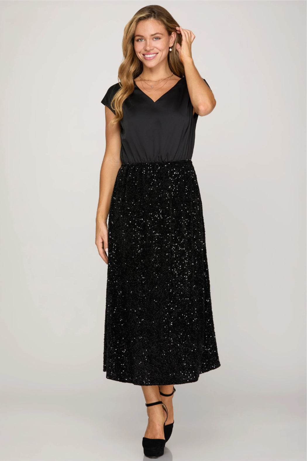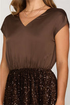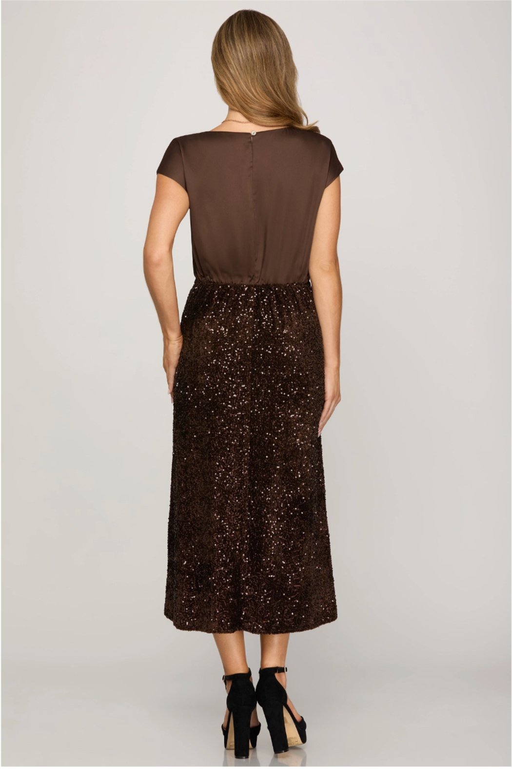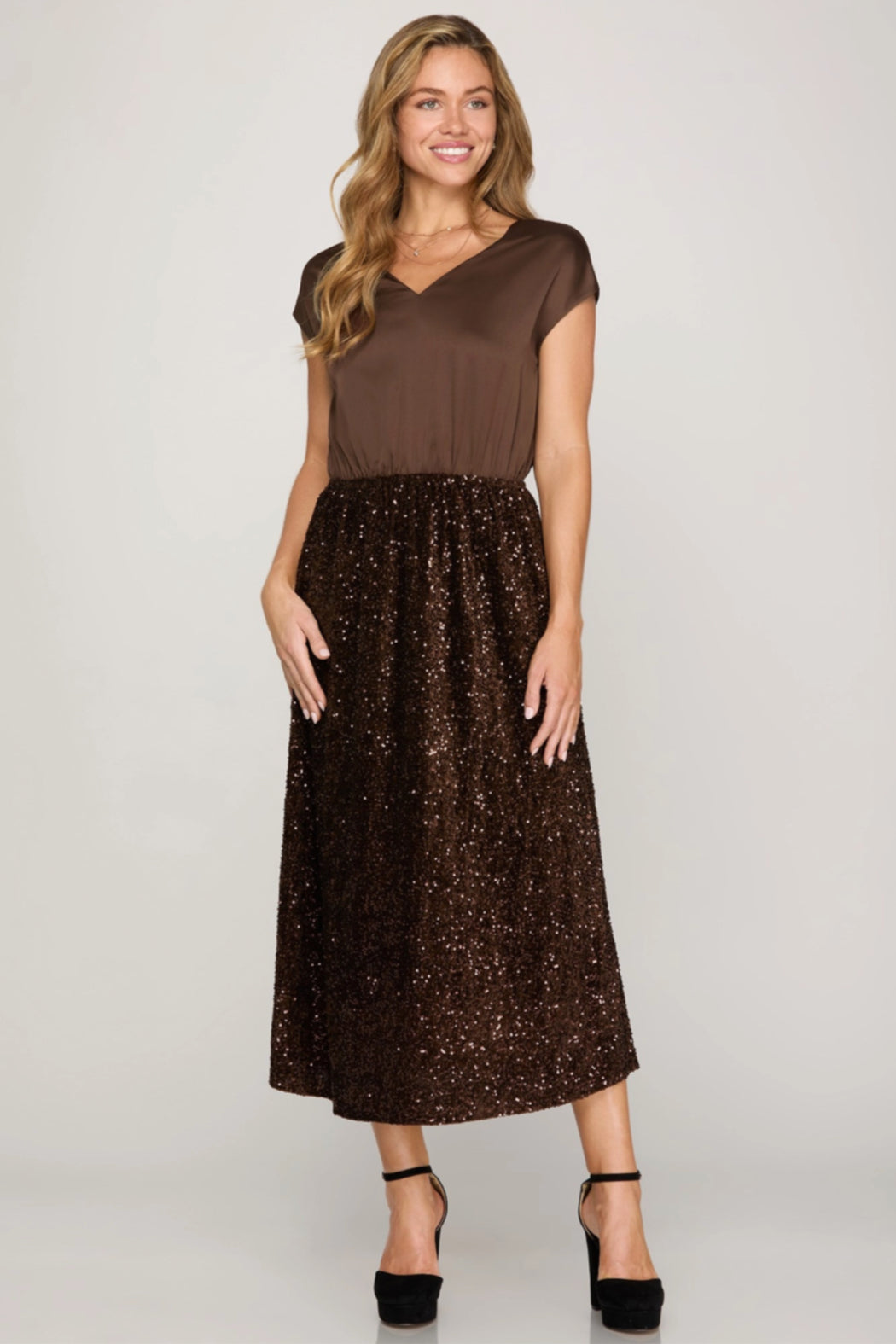 The top features a refined, fitted satin V-neck bodice with subtle cap sleeves, providing a smooth and sophisticated upper silhouette. This elegant texture is contrasted beautifully by the dramatic all-over sequin midi skirt, which offers shimmering movement and captivating sparkle. Hitting at a flattering tea-length, this dress is offered in a versatile palette, including a deep Black Sequin and a rich Chocolate Brown Sequin.