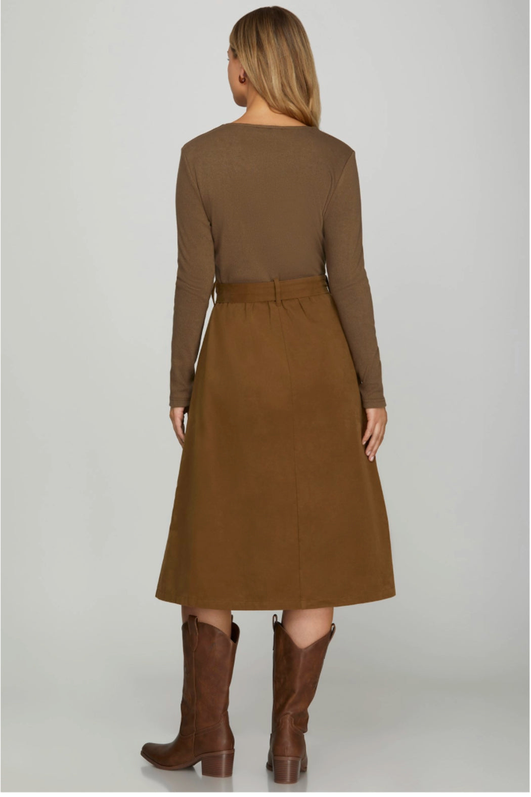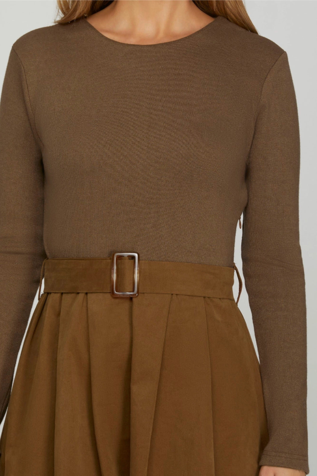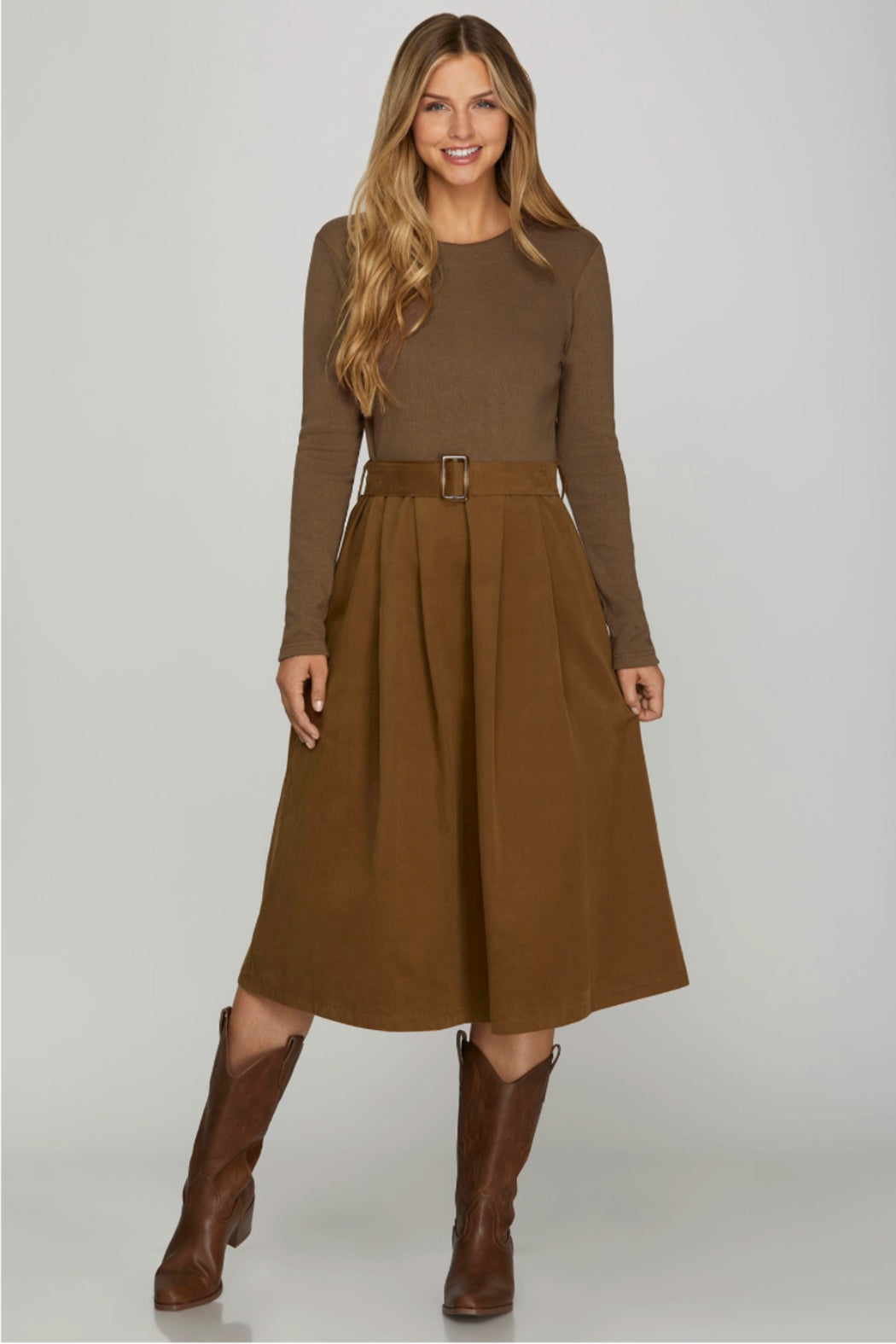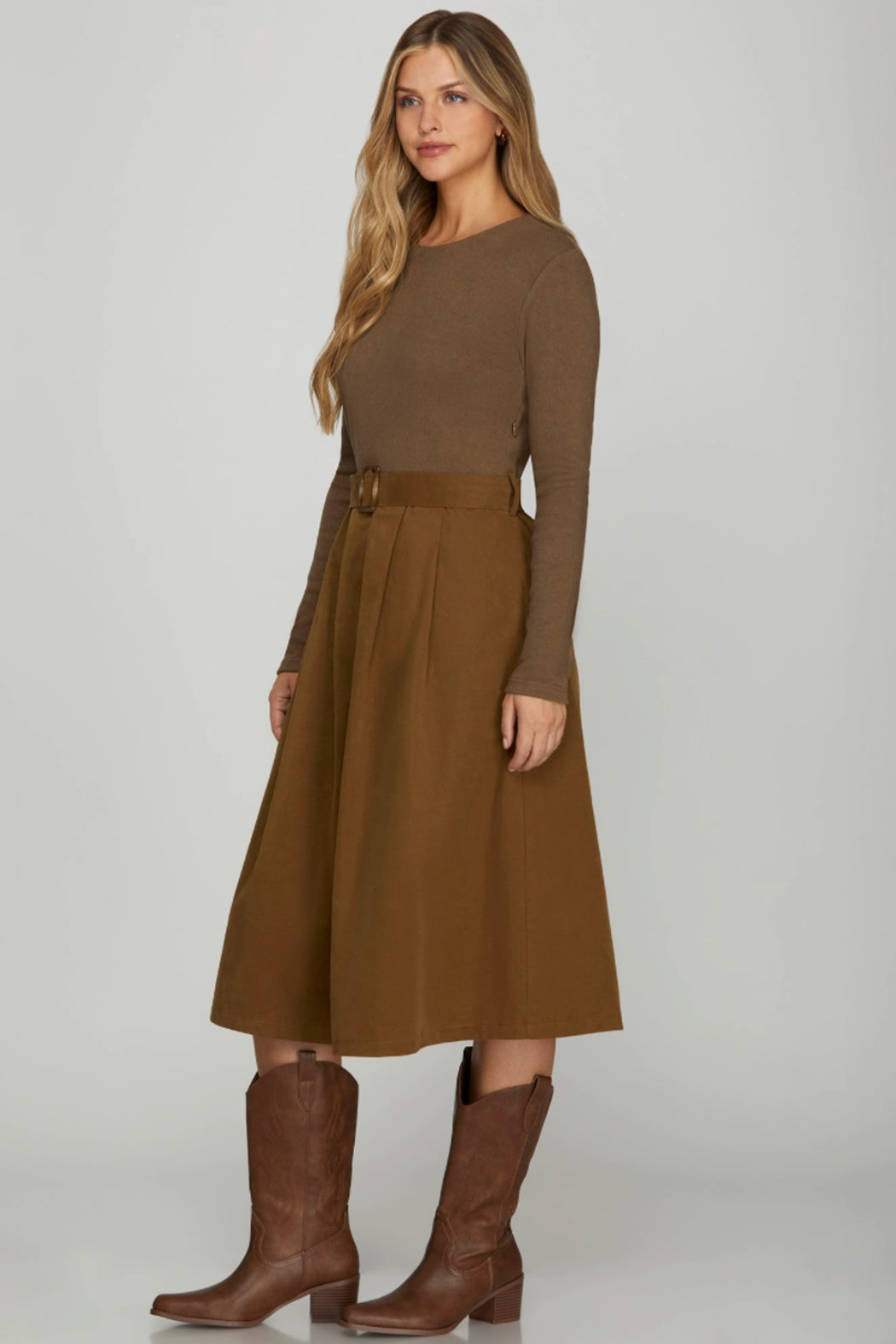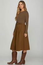 Meet The Hazelnut Dress, the ultimate definition of effortless, put-together style. This exquisite piece combines the cozy comfort of a long sleeve knit top with the polished flow of a woven midi skirt, all in one stunning dress.