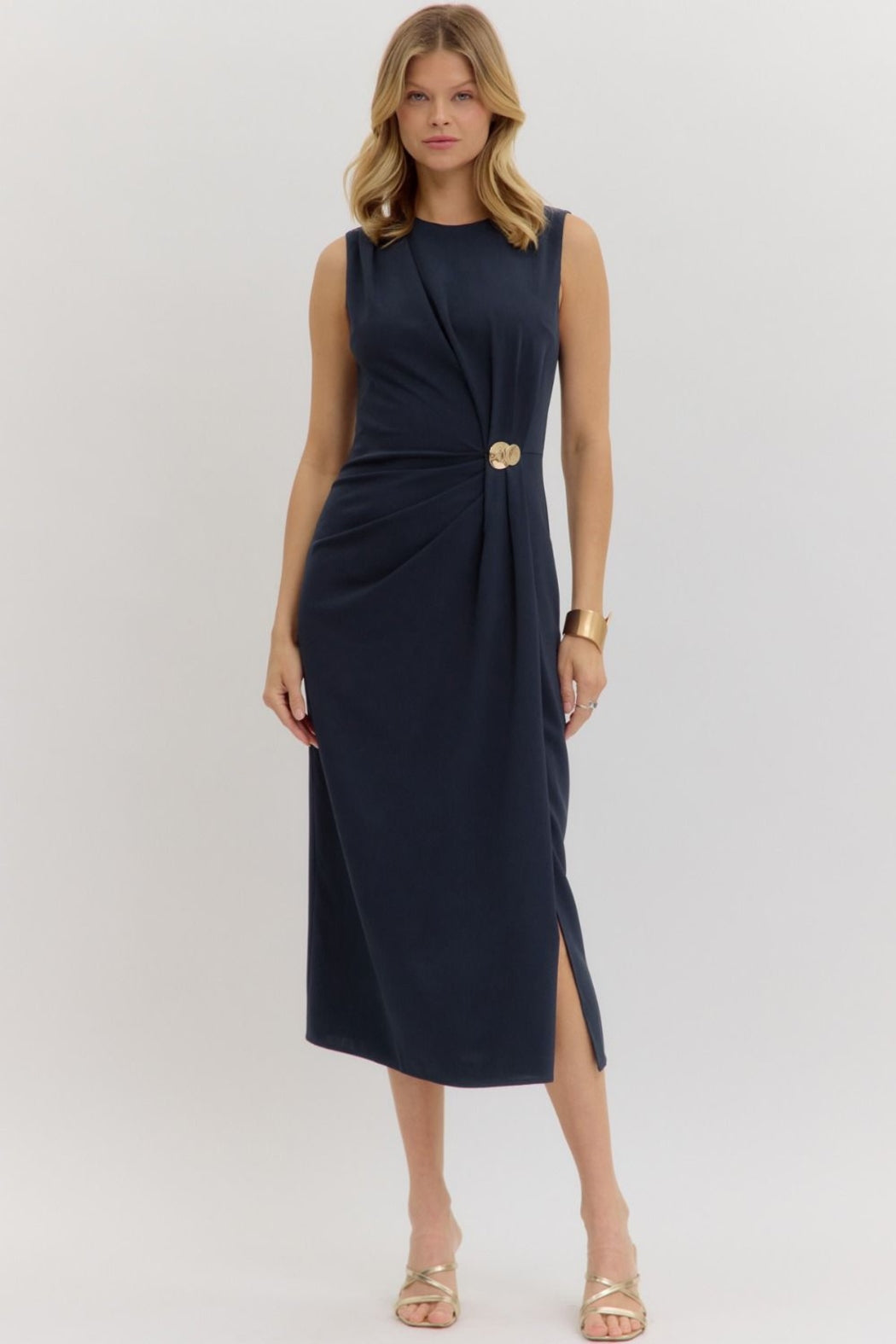 Keywords: navy blue pleated midi dress, gold trim evening dress, sleeveless boutique dress, elegant navy summer dress, lightweight lined woven dress.