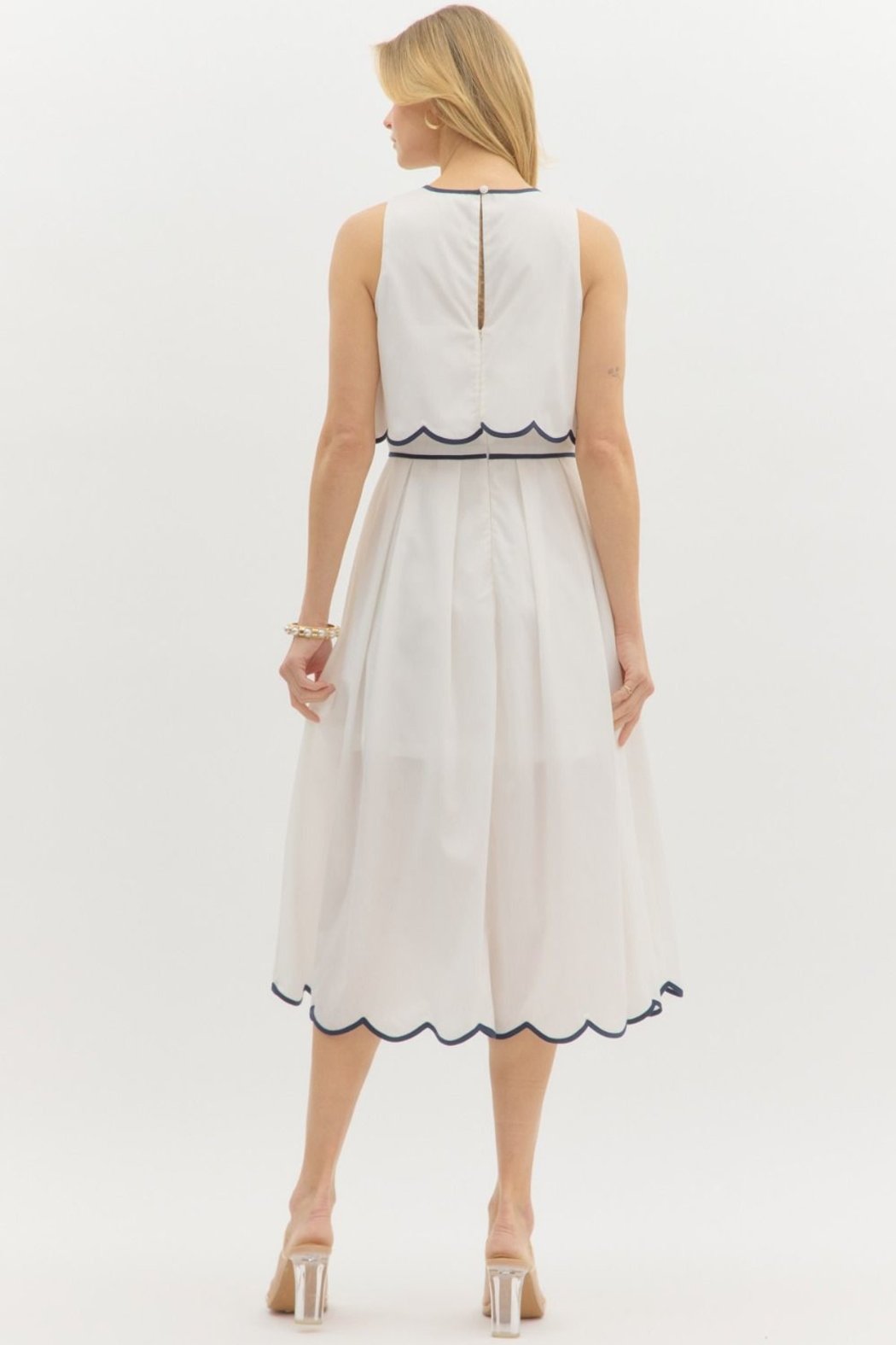 Meet The Scallop Society Dress, a timeless ode to feminine charm and effortless elegance. Crafted from a lightweight woven fabric, this solid sleeveless midi dress features a beautifully scalloped embroidered hem that adds a delicate, vintage-inspired detail. The tailored silhouette flatters while offering comfort, complete with practical side pockets and a lined interior for worry-free wear.