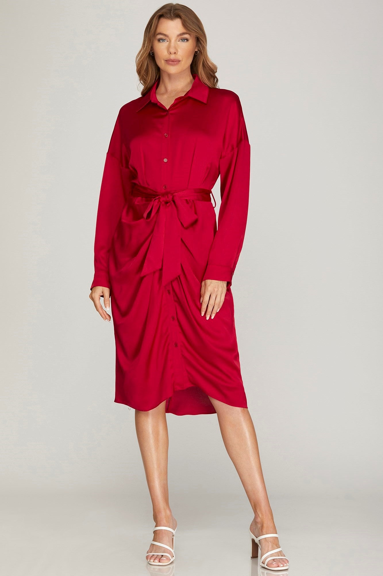 SHIRRED SKIRT CUFF SLEEVE DROP COLLAR MIDI SATIN DRESS WITH FRONT BUTTON DOWN PLACKET MODEL IS 5'8