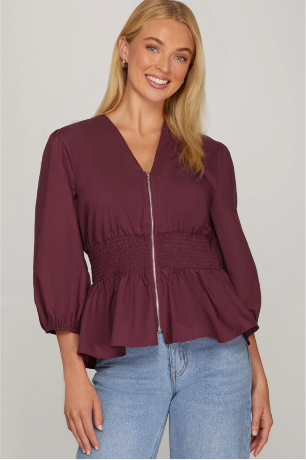 The "Vineyard Smock" Zipper Peplum Blouse Product Description: Rich Color Meets Flattering Form Embrace the opulent shades of the season with The "Vineyard Smock" Top. This richly colored blouse is an instant wardrobe upgrade, designed to perfectly combine a soft, feminine silhouette with unique, modern hardware. Crafted in a deep, sophisticated burgundy or maroon color, the top features a flattering V-neckline that leads into a striking silver front zipper. The star of the show is the central smocked panel, which cinches the waist beautifully before flaring out into a playful peplum hem. The look is finished with chic 3/4 sleeves that feature a subtle puff or balloon shape for added volume and polish. The "Vineyard Smock" Top is ideal for transitioning your style from day to night. Pair it with crisp black trousers and heels for a professional, put-together look, or wear it with denim and boots for a stylish gathering with friends. Key Features & Selling Points: Vineyard Color: A rich, deep burgundy/maroon shade perfect for fall and winter. Flattering Smocked Waist: Creates an hourglass shape and leads to a voluminous peplum. Modern Zipper Detail: A striking silver front zipper adds an edgy, contemporary accent. Chic 3/4 Sleeves: Features a stylish balloon or puff sleeve design. Versatile Occasion Wear: Excellent for workwear, date night, or smart casual events.