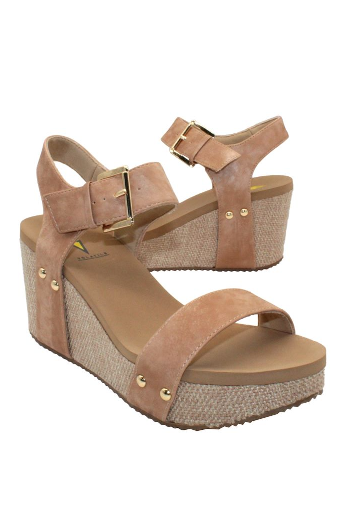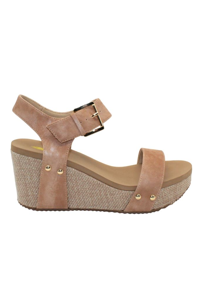 Fabric covered wedge with a rubber traction outsole. Approx. 3.25” heel height with 1.5” platform