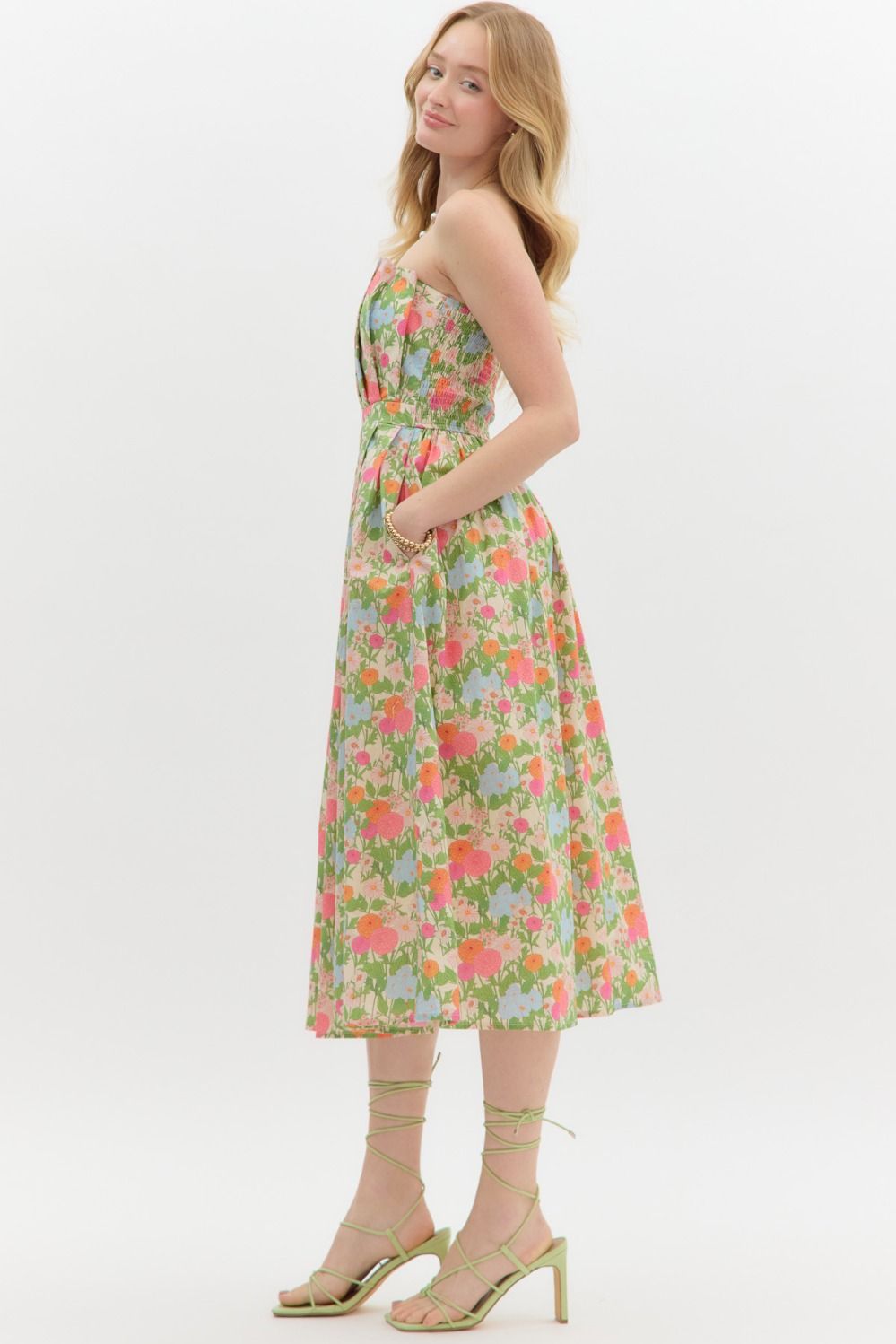 Step into a dreamy retro vibe with the Wildflower Waltz Dress—a multicolor floral strapless pleated midi dress that’s equal parts boho-chic and effortlessly feminine. Designed with a flattering pleated silhouette and a smocked elasticated back panel for a comfortable fit, this dress moves with you from golden hour strolls to sunset soirées.