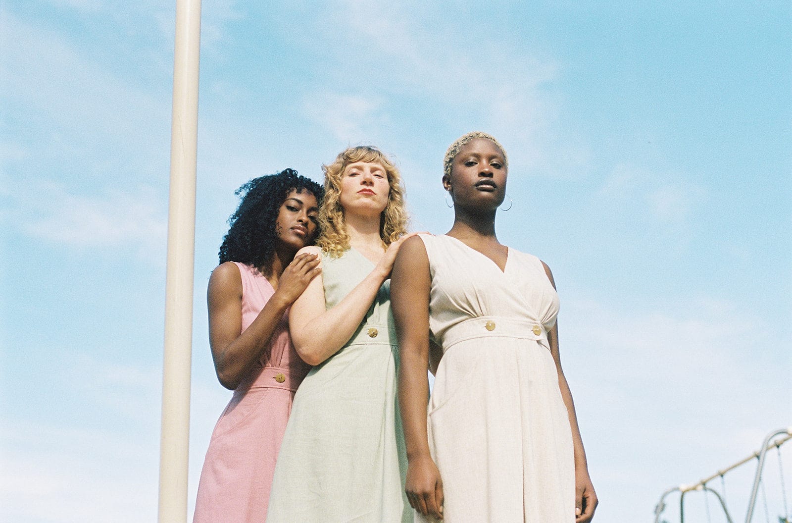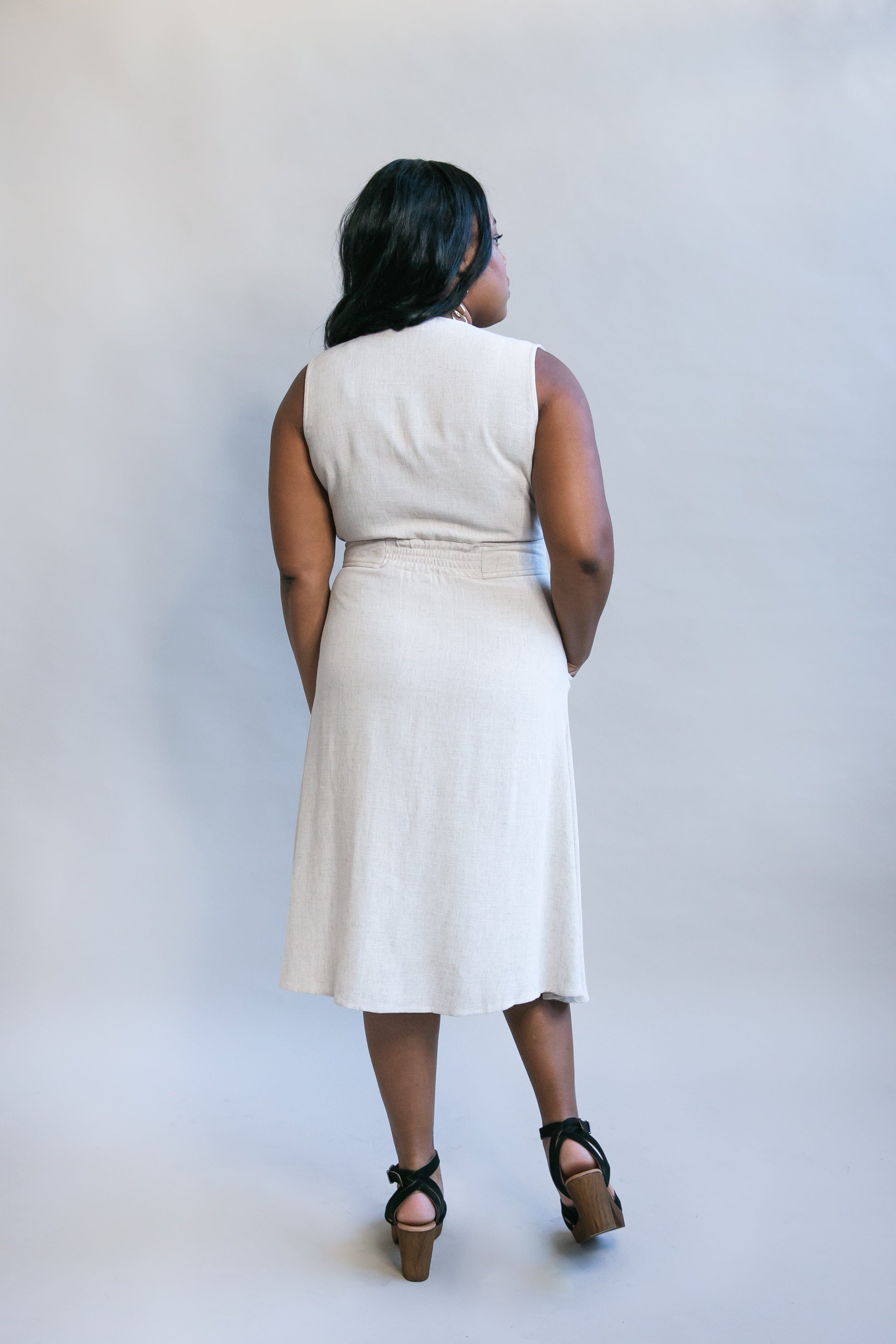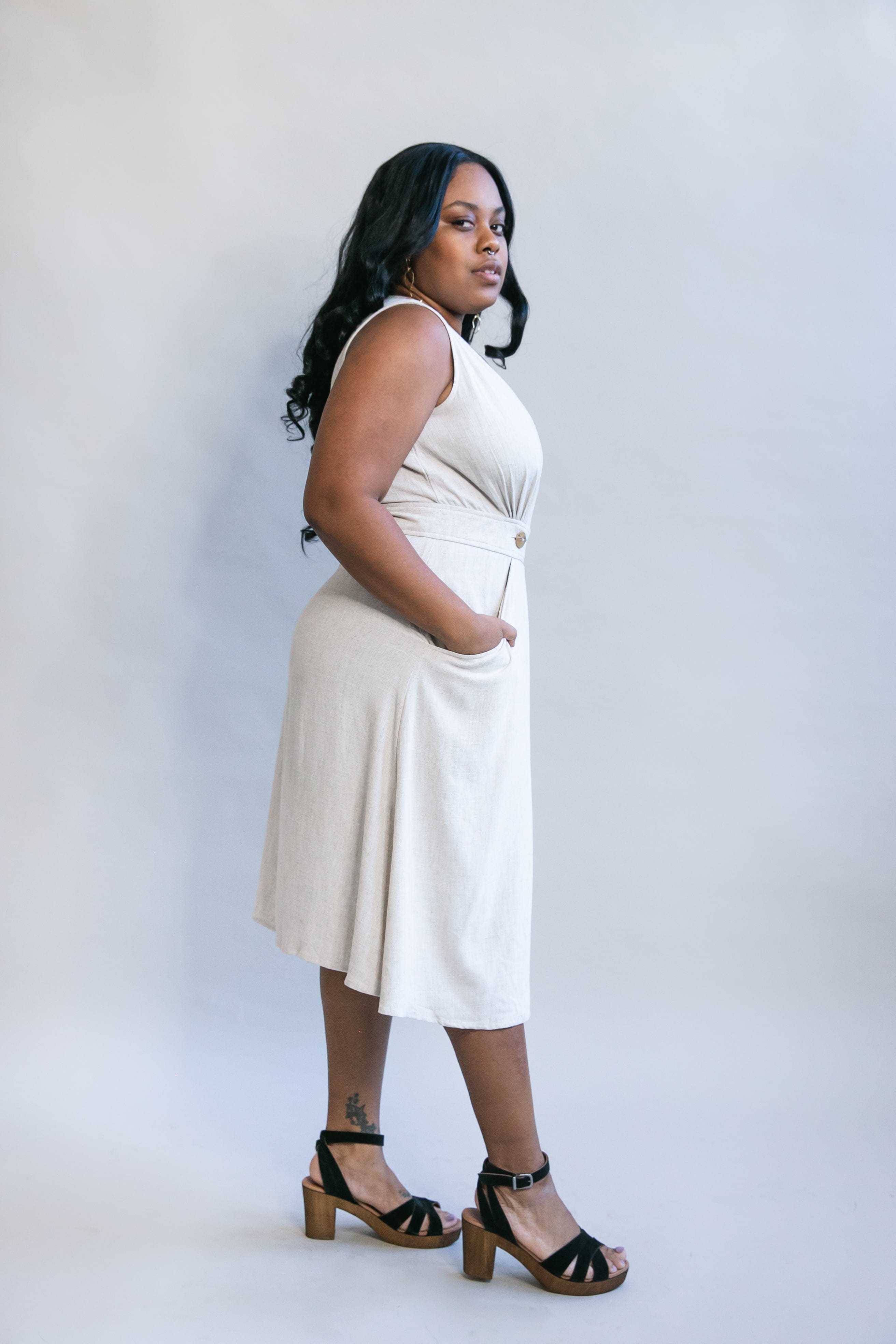 A 90's inspired look that is easy to wear and is sure to become a favorite staple in your closet. Bias binded cross over neck line and buttons at the high waist. With 2 large bamboo buttons for closure. Elastic smocking on the back for breathing and eating. Large inset pockets you could fit a puppy in. Sleeveless bias bound armholes that cleanly finishes seams. A line skirt with a little flair. Gathered at the bust for ample breast room with out being saggy on smaller boobs. Breast feeding friendly style. Structured waist band with center pleat for a comfy fit that flatters.