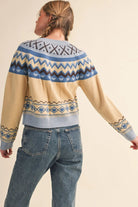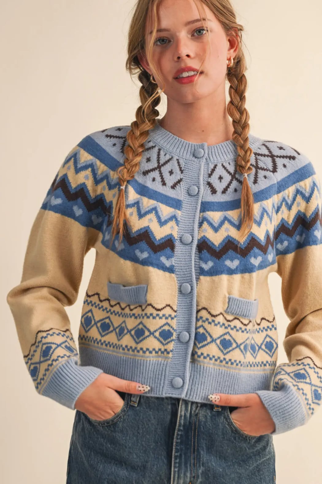 This fair isle sweater cardigan is everything you need for a sweet and romantic Fall look! Cozy sweater knit shapes this charming cardigan that has a round neckline, button down placket, and long sleeves with raglan seams. Bodice features a fair isle inspired design and contrast ribbed knit accents the neckline, button placket, cuffs, and hem.