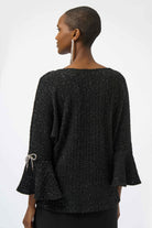 DESCRIPTION Indulge in the charm of this fuzzy metallic knit top, where a relaxed boxy silhouette meets a chic cowl neck. Three-quarter ruffled sleeves and a dazzling rhinestone bow detail add a playful touch to the garment.