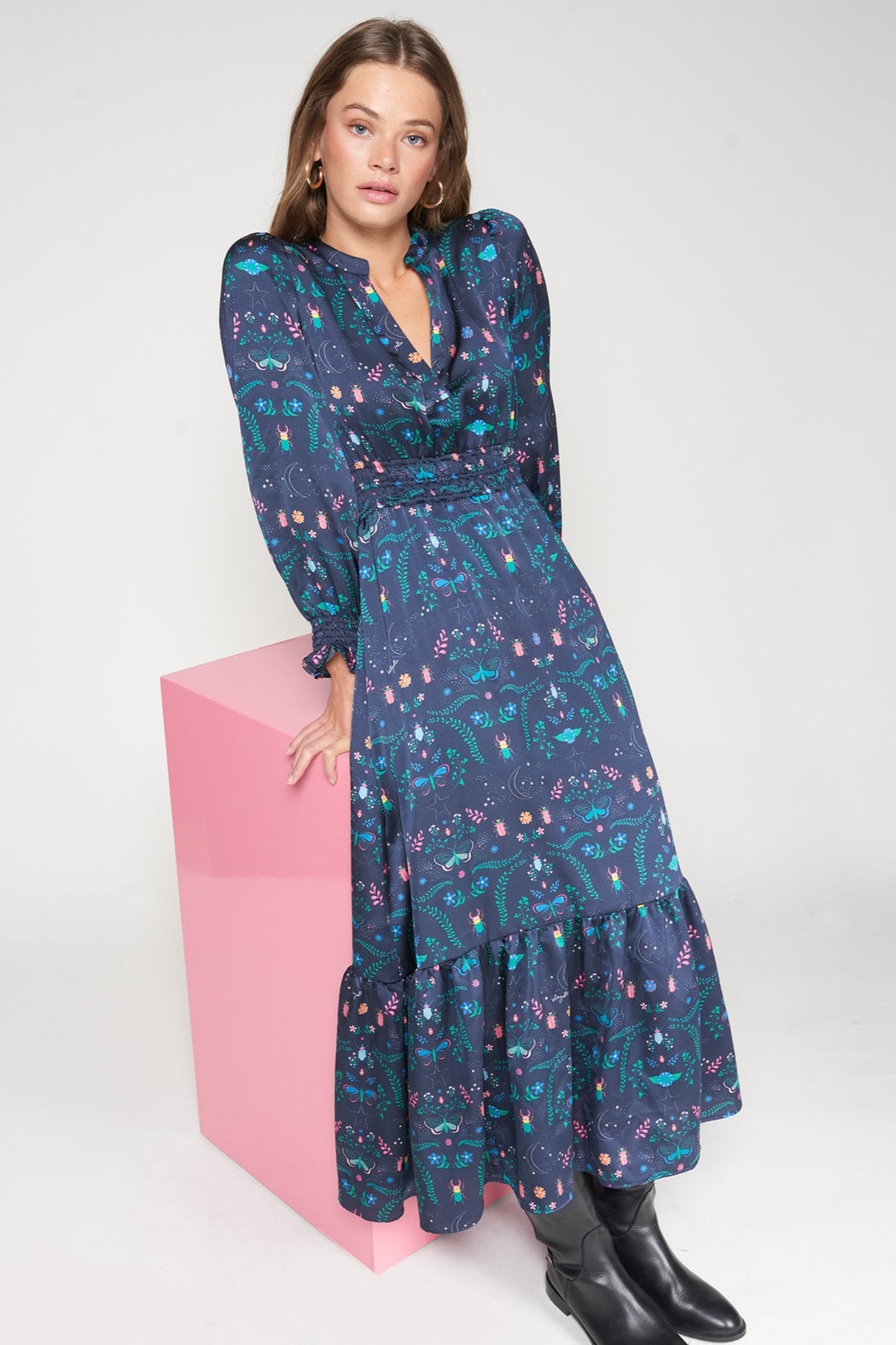 Long navy dress featuring a multicolor print of insects, flowers and organic shapes. Straight fit with gathered volume at the hem. Long puffed sleeves with elastic cuffs. V-neckline. Smocked elastic waist for comfort. Fluid and soft fabric, perfect for autumn-winter.