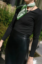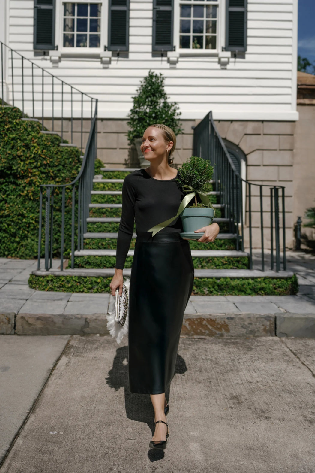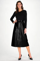 A sleek, long black dress crafted from ponte with vegan leather panels for a tailored, modern finish. The Lorraine Dress in Black Ponte and Vegan Leather by Duffield Lane pairs a fitted bodice with a straight maxi skirt for a refined silhouette. It features long sleeves and a high waistline that reads polished for the office or a night out. Wear it with simple heels for a contemporary, classic look.