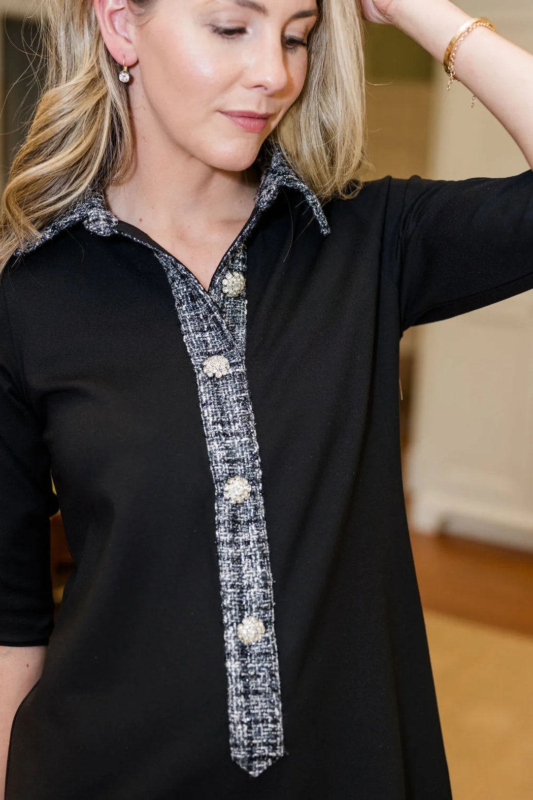 A simple, tailored shift cut in a soft knit with contrast tweed trim and decorative buttons. The Penny Dress from Duffield Lane features a knee-length silhouette and three-quarter sleeves for easy, polished wear. The sweater-like fabric and preppy tweed placket give it a classic, work-ready vibe that also works for casual outings. Pair with loafers or low heels for a refined everyday look.