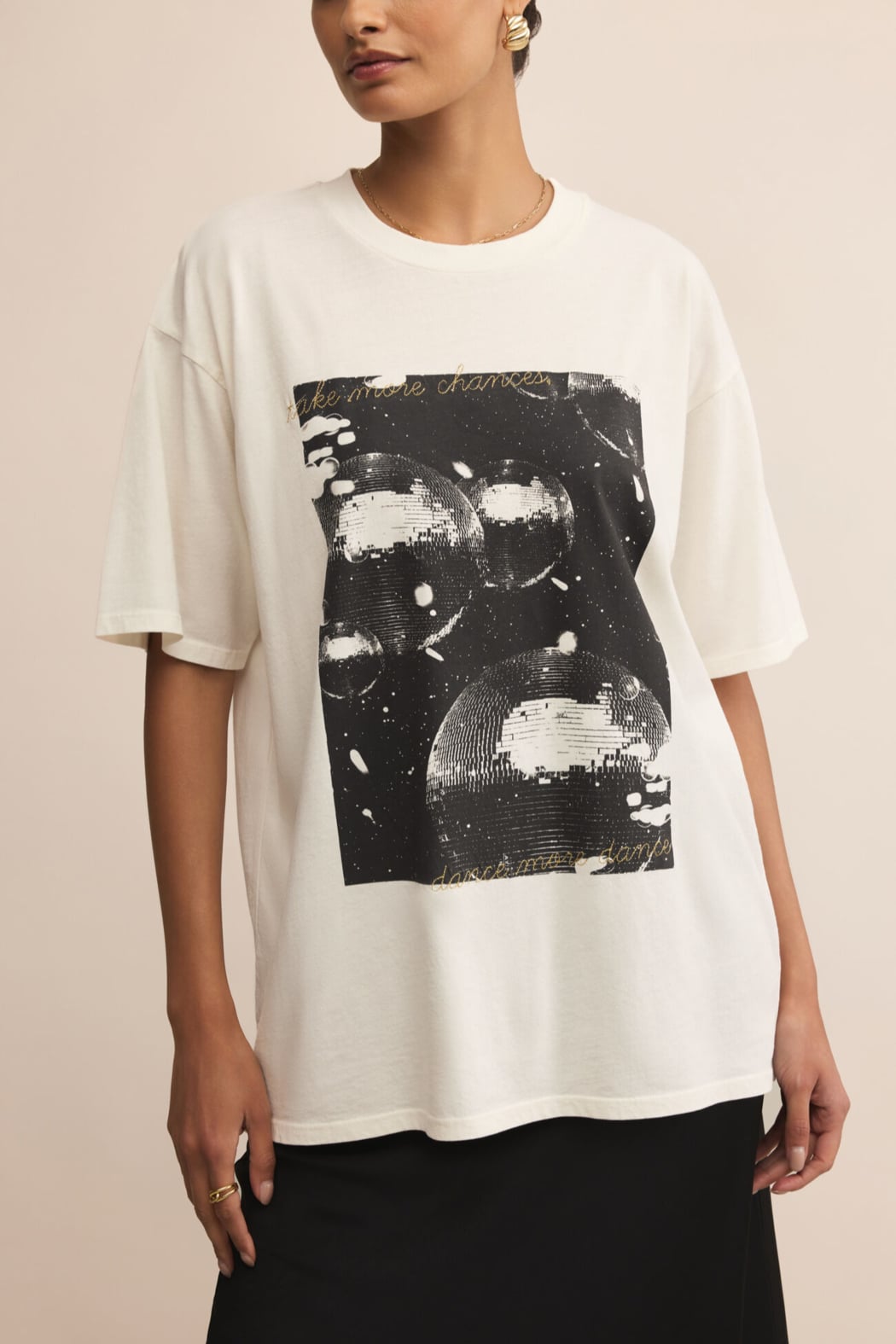 The Dance More Dances City Tee is an oversized women's graphic t-shirt with a bold disco-ball print and a relaxed boxy silhouette. Z Supply brings a soft, lived-in cotton jersey feel and a classic crew neckline for easy everyday wear. Short sleeves and a slightly longer hem make it effortless to layer or pair with skirts and denim for casual days or low-key nights out.