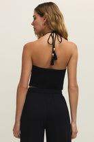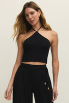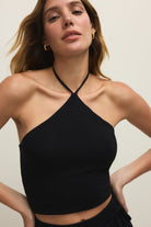 The Lydia Halter Top is a cropped, sleeveless knit that fastens in a slim halter silhouette for a clean, modern look. z supply makes this piece with a figure-skimming fit and a high neckline that ties behind the neck. Wear it alone for warm-weather days or layered under jackets for evening plans. Its minimalist black finish keeps the styling versatile for casual or night-out occasions.