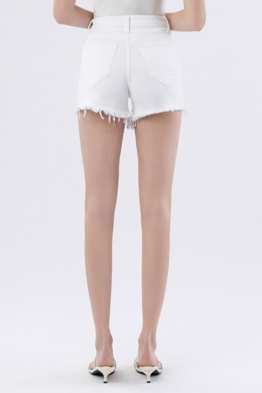 COMFORT STRETCH DENIM, SUPER HIGH RISE WAIST, FRAYED HEM, A LINE SHORTS