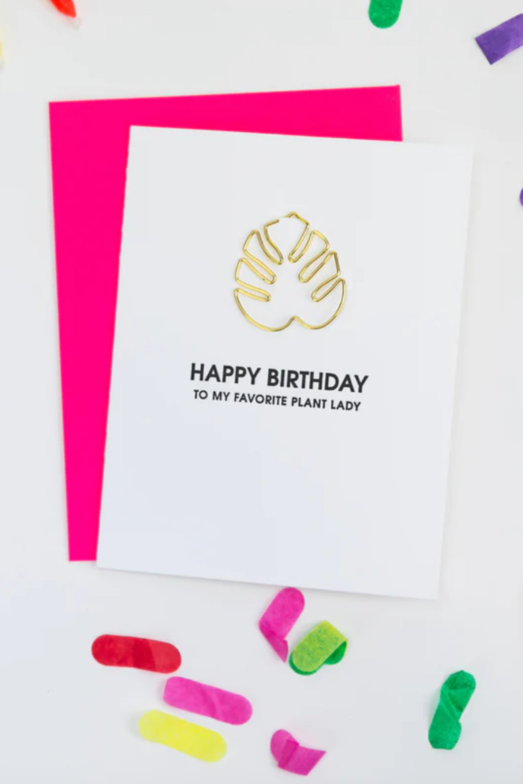 Our "Happy Birthday Plant Lady" card is letterpress printed on a vintage printing press in sunny California. Card includes a heavy duty monstera leaf paper clip. Paperclip can be used as a giftcard or cash holder on the inside of the card. Once you are finished using with the card, it can be used as a paperclip or bookmark. DETAILS Paper: Bright White, Tree Free Paper Envelope: Neon Pink Ink: Black Ink Size: 4.25” x 5.5” Folded card, blank inside Sealed in a cello sleeve