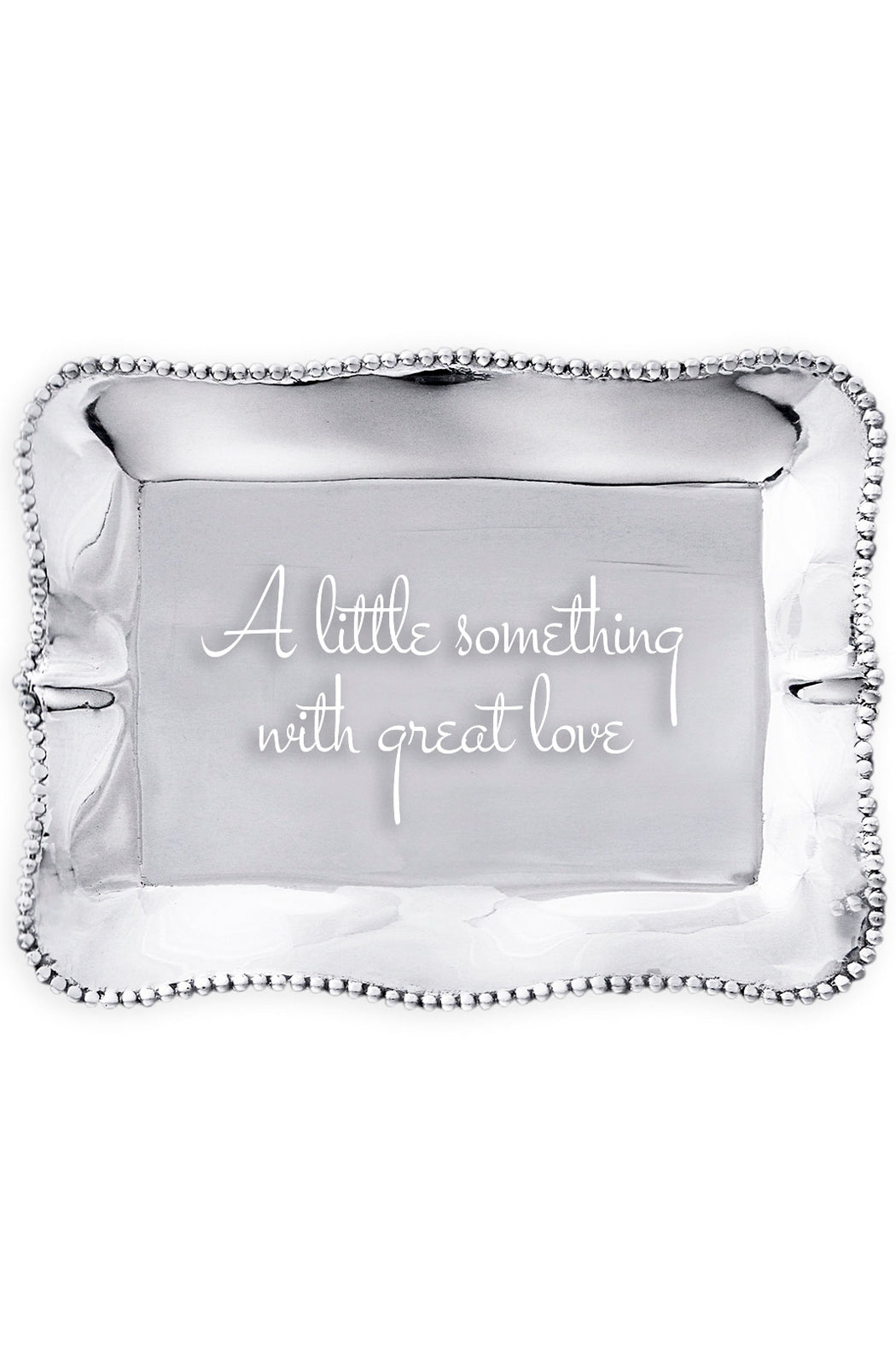 Looking for a little something to express your love? Check out this sweet GIFTABLES Pearl Rectangular Engraved Tray from Beatriz Ball. Engraved with the slogan, "A little something with great love," this delightful mini tray is distinguished by its rich, hand-finished surface, and practical size. Perfect on the desk, vanity, or bedside table for jewelry, keys or coins, or on the coffee table as a decorative accent. Makes a lovely present for the Holidays, birthdays, anniversaries, and other occasions. Handmade of an FDA safe, easy-care, oven, and freezer friendly aluminum alloy.