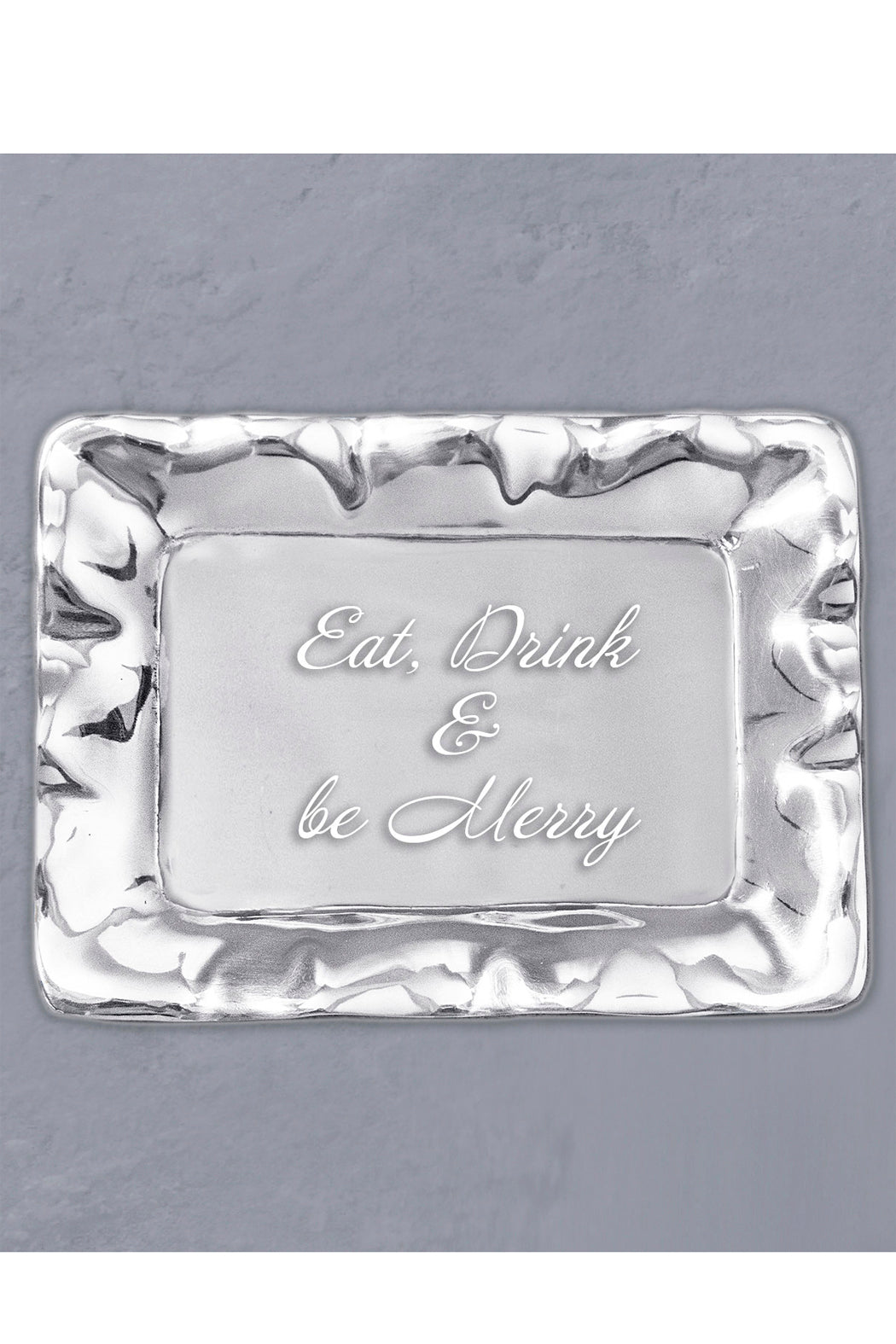 Words to live by... Share your commitment to the good life with this delightful GIFTABLES Vento Rectangular Engraved Tray from Beatriz Ball. Engraved with the slogan, "Eat, Drink and Be Merry," this delightful mini tray is distinguished by its rich, hand-finished surface, and practical size. Perfect on the bar, dining table, or coffee table as a decorative accent.