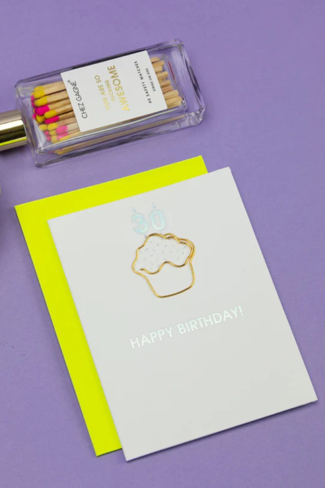 Our "Happy Birthday Candles 30" card is letterpress printed on a vintage printing press in sunny California. Card includes a heavy duty cupcake paper clip.