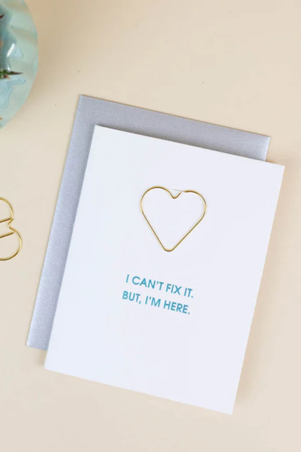 Our "I Can't Fix It, But I'm Here " card is letterpress printed on a vintage printing press in sunny California. Card includes a heavy duty heart paper clip.
