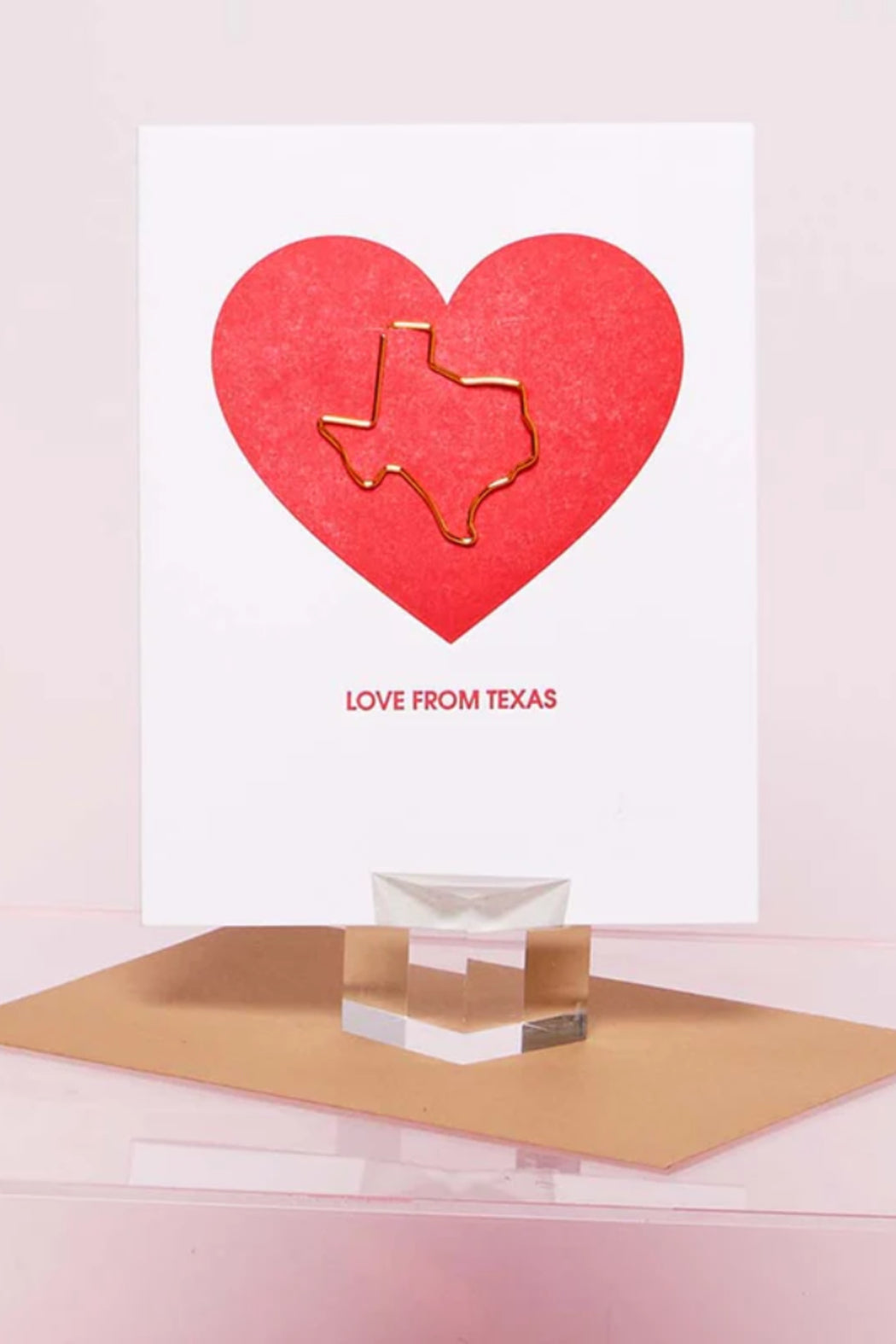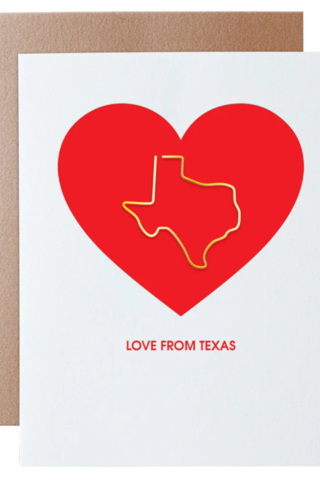 Our "Love From Texas" card is letterpress printed on a vintage printing press in sunny California. Card includes a heavy duty Texas paper clip. Paperclip can be used as a giftcard or cash holder on the inside of the card. Once you are finished using with the card, it can be used as a paperclip or bookmark. DETAILS Paper: Bright White, Tree Free Paper Envelope: Kraft Ink: Red Size: 4.25” x 5.5” Folded card, blank inside Sealed in a cello sleeve